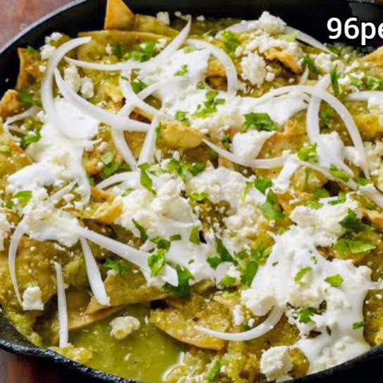 Tortilla de maíz frita en salsa verde con queso gratinado, cebolla y cilantro.