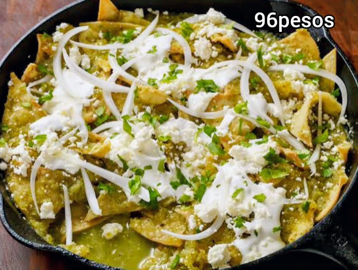 Crujientes totopos de tortilla de maíz bañados en salsa verde tradicional, acompañados de queso, cebolla y cilantro fresco.