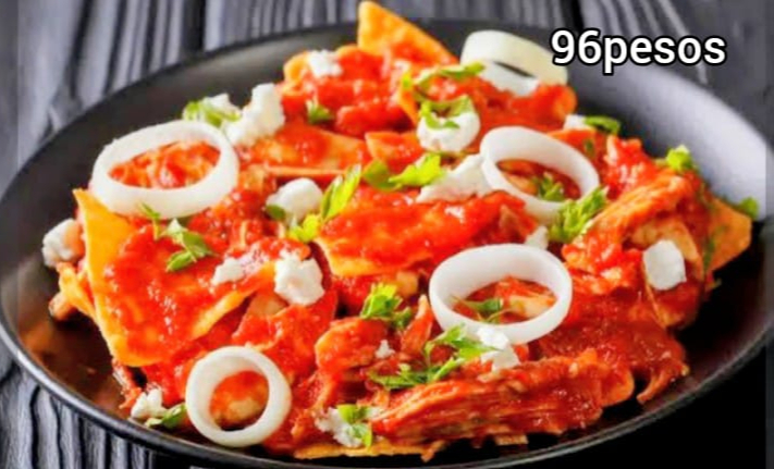 Tradicionales tortillas de maíz en trozos, servidas con salsa roja especial, queso fundido, cebolla y cilantro.