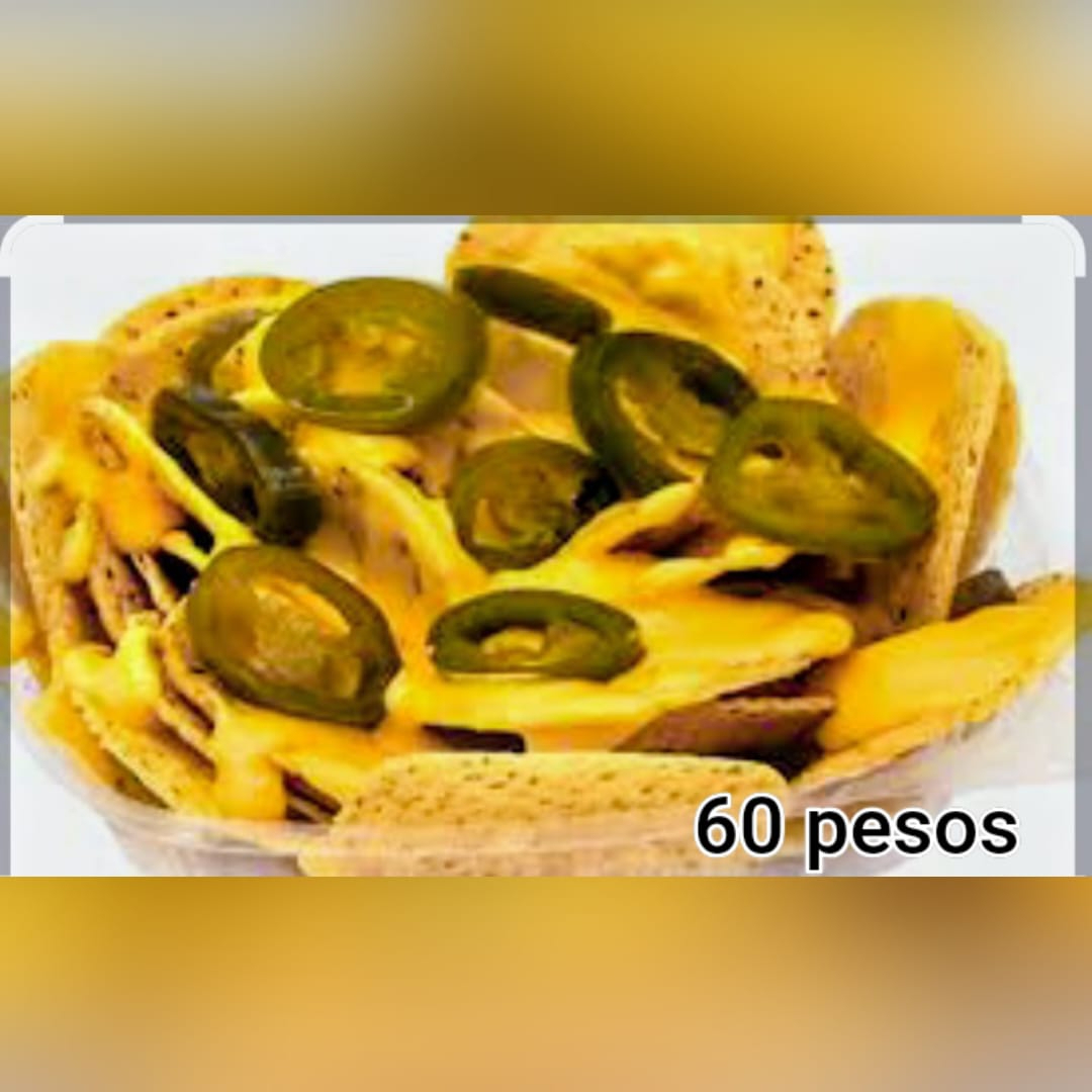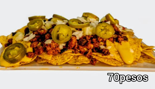 Combinación de papas fritas con trozos de salchicha, queso y cátsup al gusto.