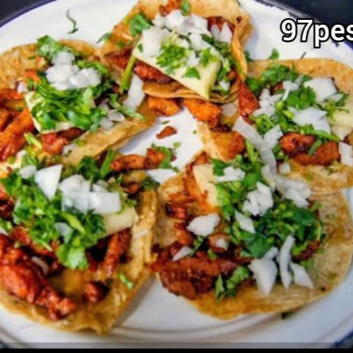5 Deliciosos tacos en tortilla de maíz con carne de pastor marinada, servidos con cebolla, cilantro y salsita.