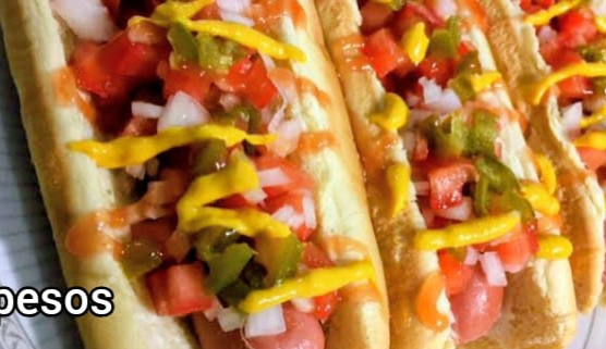 Pan de hot dog con salchicha, wini, mayonesa, mostaza, cátsup y un toque de pico de gallo.