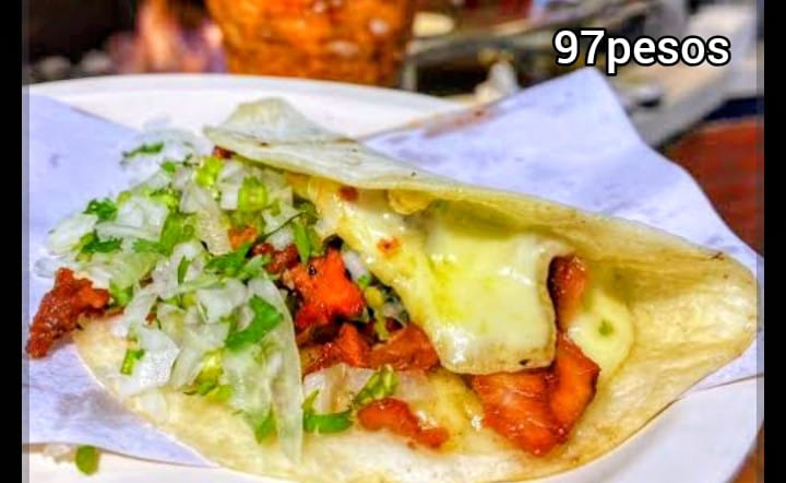 Tortilla de harina rellena de carne al pastor, queso derretido, aguacate, cebolla, cilantro y salsa.