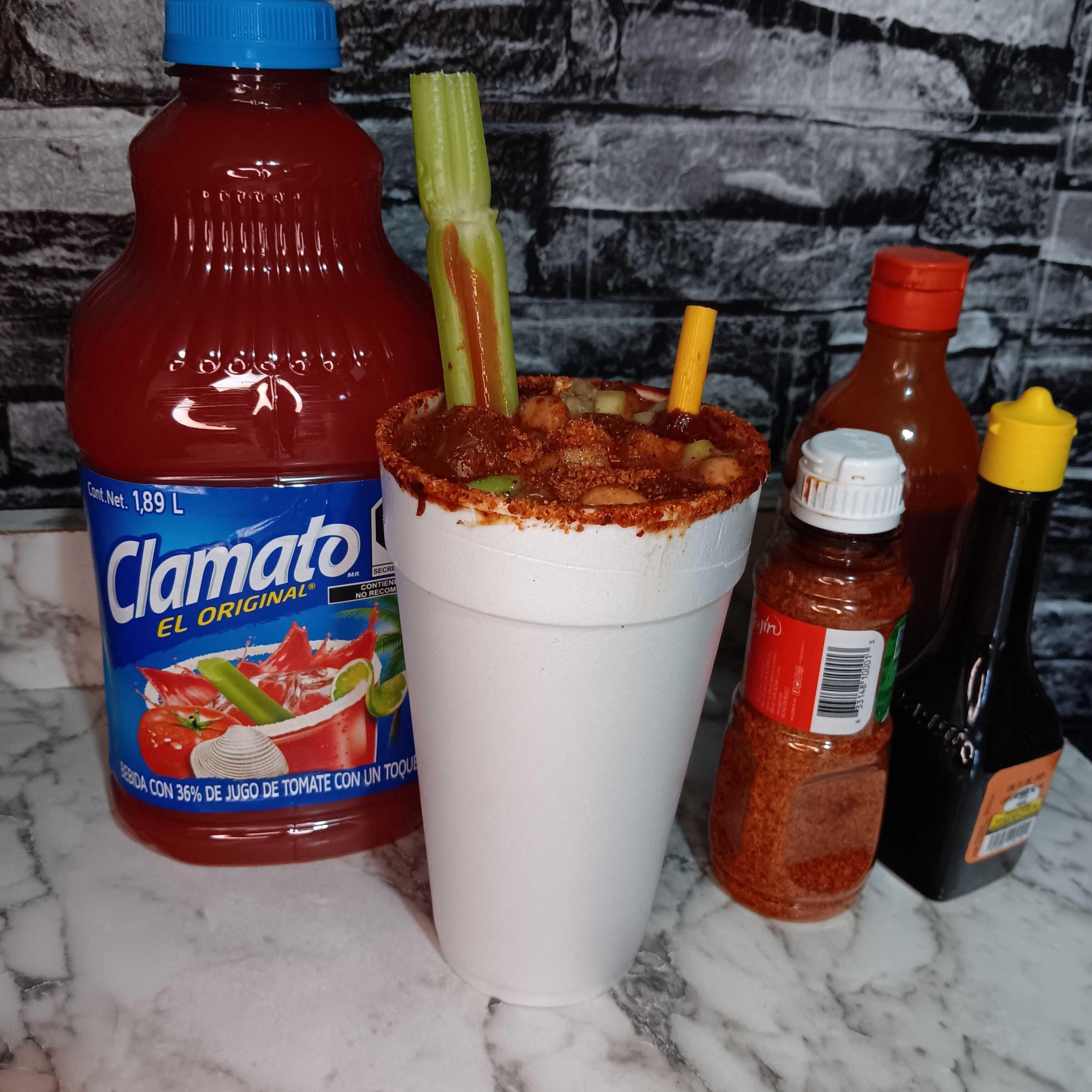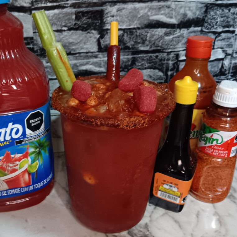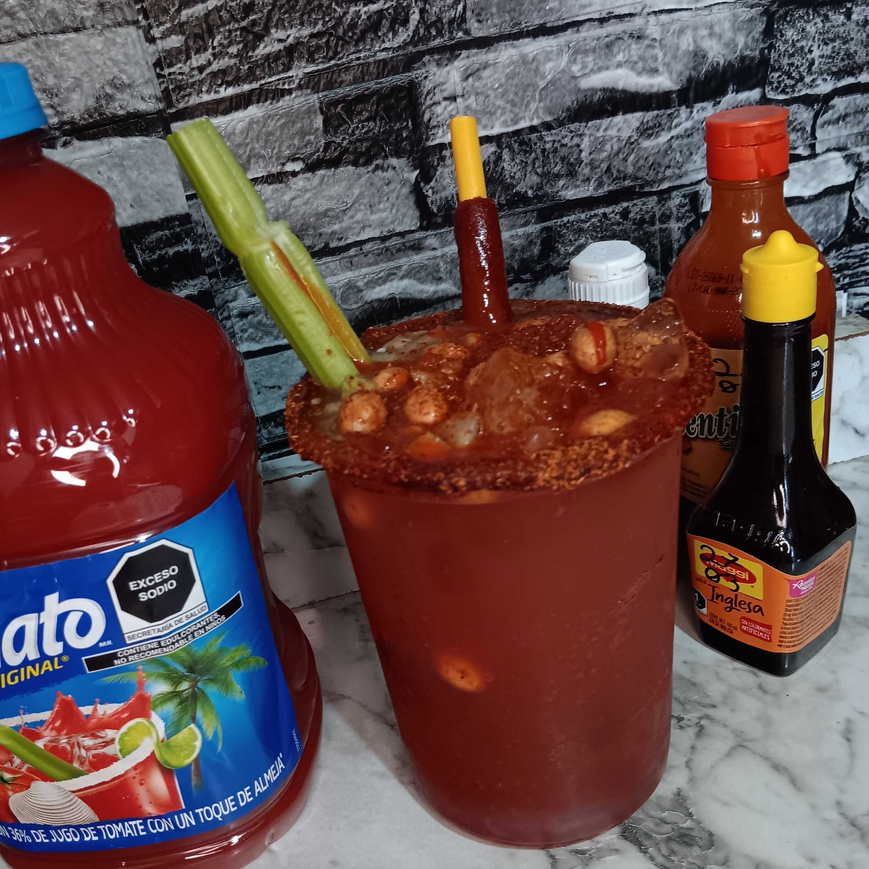 Clamato, apio, pepino, cacahuate, limón, valentina, salsa inglesa, chamoy, tajín y tamarindo