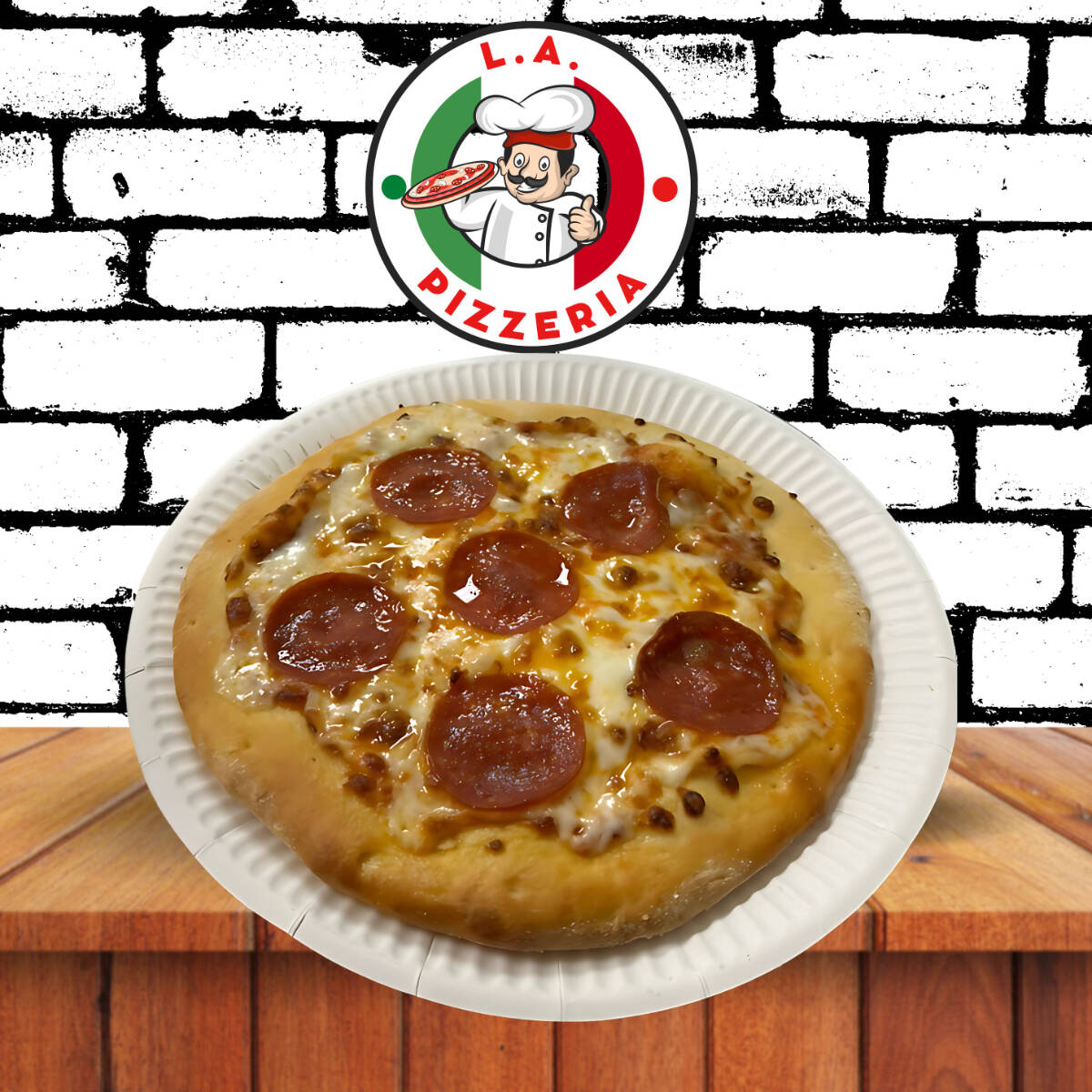 Riquísima Pizza de 7" con salsa de tomate, queso mozarella especial y pepperoni.