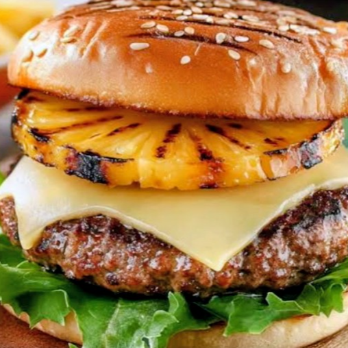 Deliciosa combinación de carne, queso y rodajas de piña dulce, acompañada de papas fritas tradicionales.