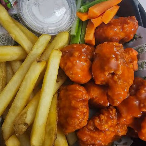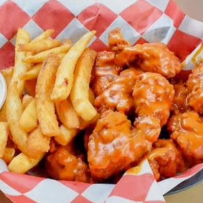 Medio kilogramo de boneless de pollo con opción de elegir hasta dos salsas, acompañado de 250 gramos de papas fritas.