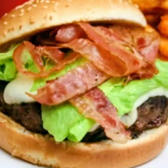 Hamburguesa clásica reforzada con crujientes tiras de tocino ahumado, servida con papas fritas.