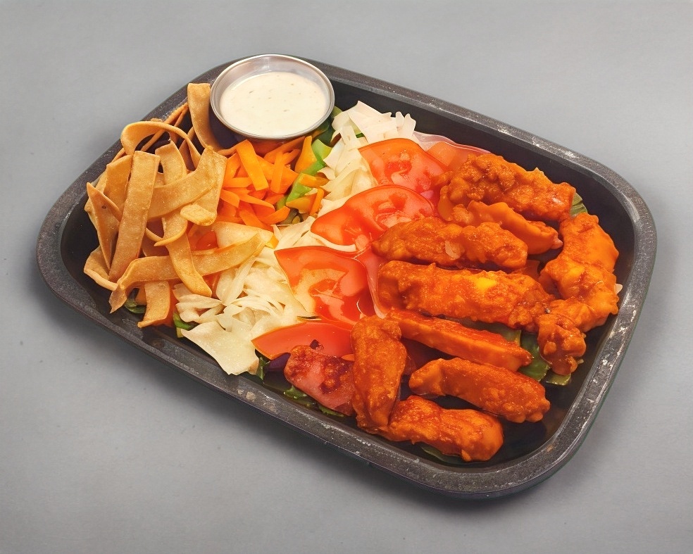 Mix de lechugas, tomate, zanahoria y jícama, con pechuga de pollo frito bañado en salsa buffalo acompañado de tiritas de tortilla y aderezo ranch.