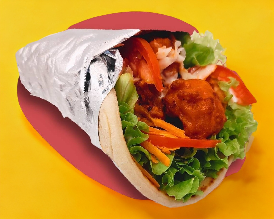Sandwich en pan pita griego con pechuga de pollo bañada en salsa buffalo, zanahoria, tomate, jícama.Ranch. Acompañado de papas fritas.