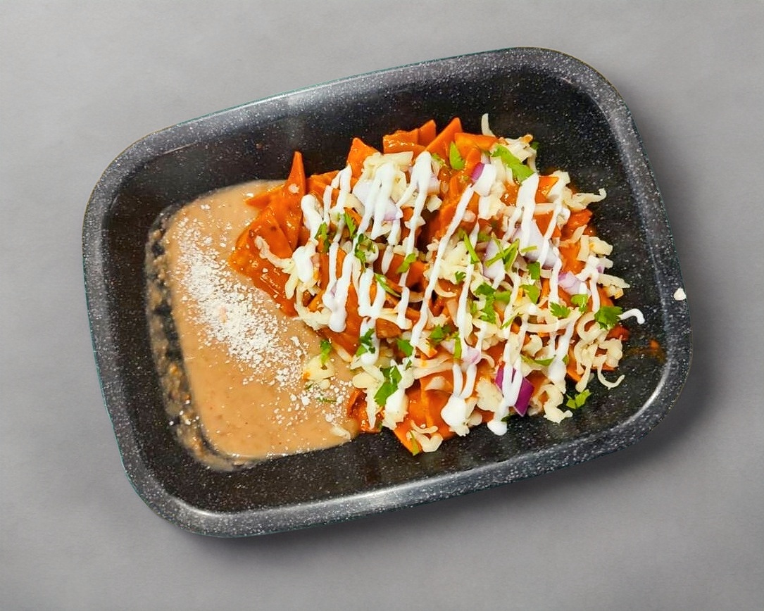 Nuestrso deliciosos chilaquiles bañados en picosita salsa cremosa verde o chipotle, coronados con queso,cebolla cilantro acompañados de frijoles refritos