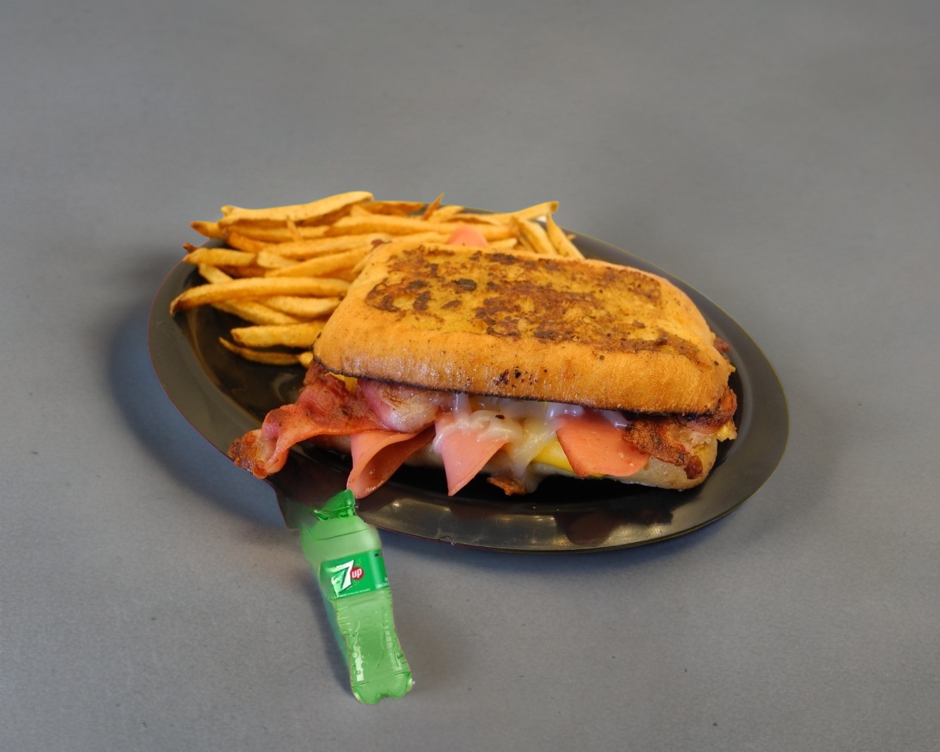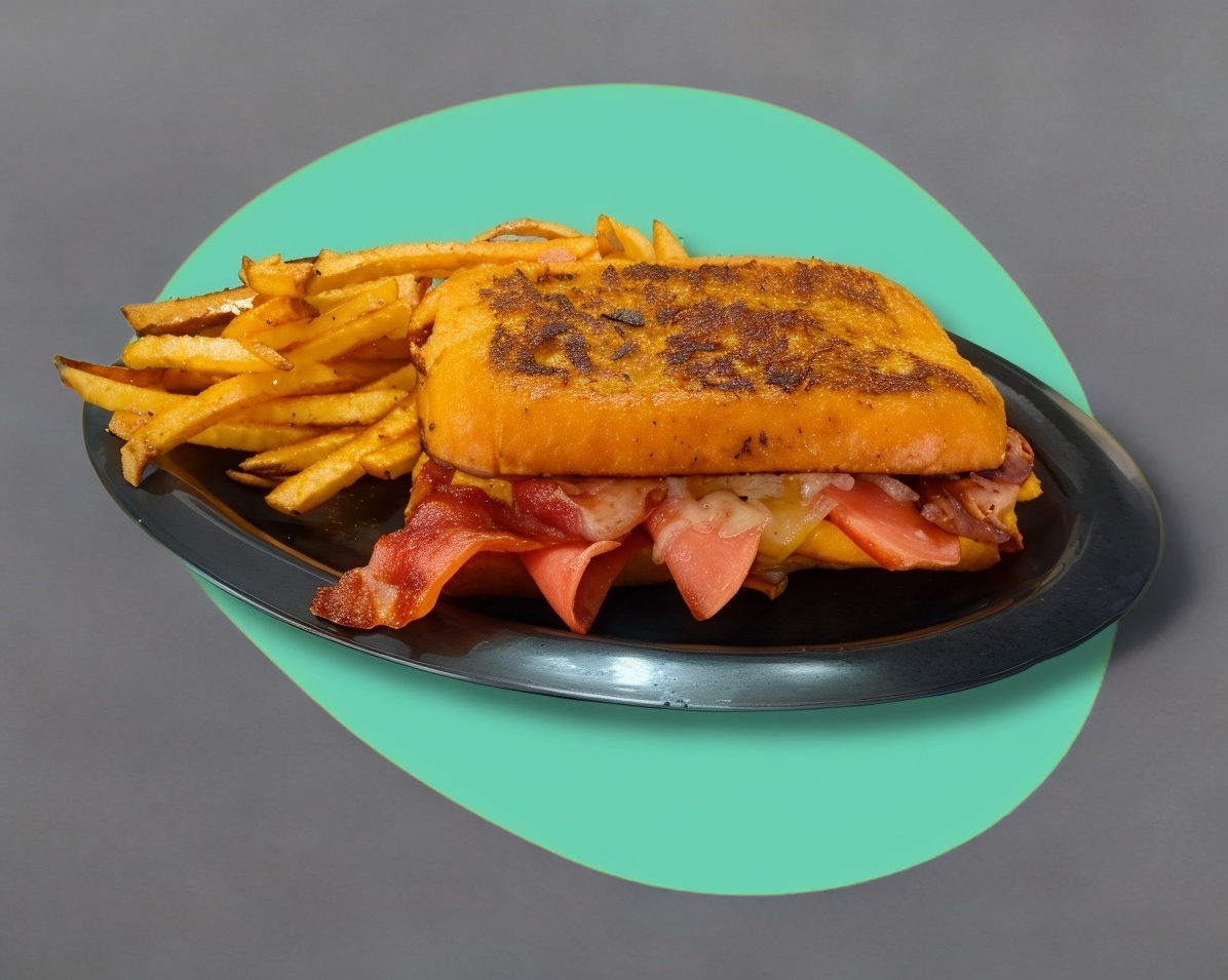 Nuestra versión del sándwich Montecristo, pan francés con jamón y queso gratinado servido con miel y acompañado de papas fritas
