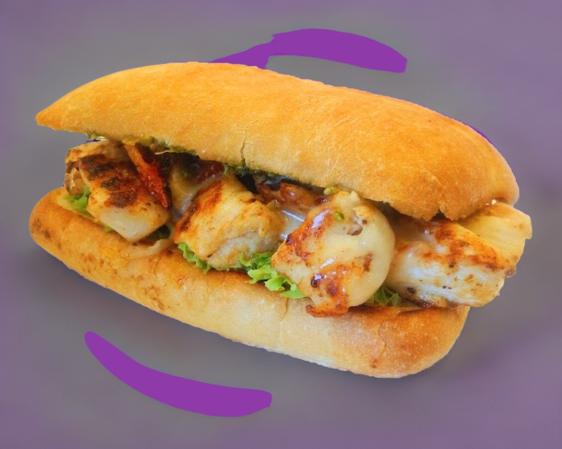 Sandwich en pan ciabatta con pechuga de pollo y tomate deshidratado bañado con nuestra salsa pesto casera, con queso gratinado en una cama de espinacas. Acompañado de papas fritas.