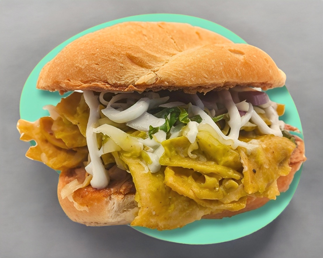 Torta con doradito con mantequilla, frijoles, queso y tu eleccion de chilaquiles en salsa verde o de chipotle. Acompañado de papas fritas