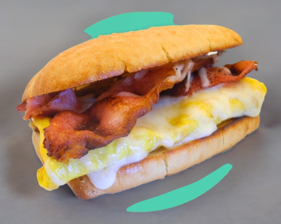 Sandwich en pan de chapata de omelet con tocino y queso,lechuga, tomate y aderezo chipotle acompañado de papas fritas.