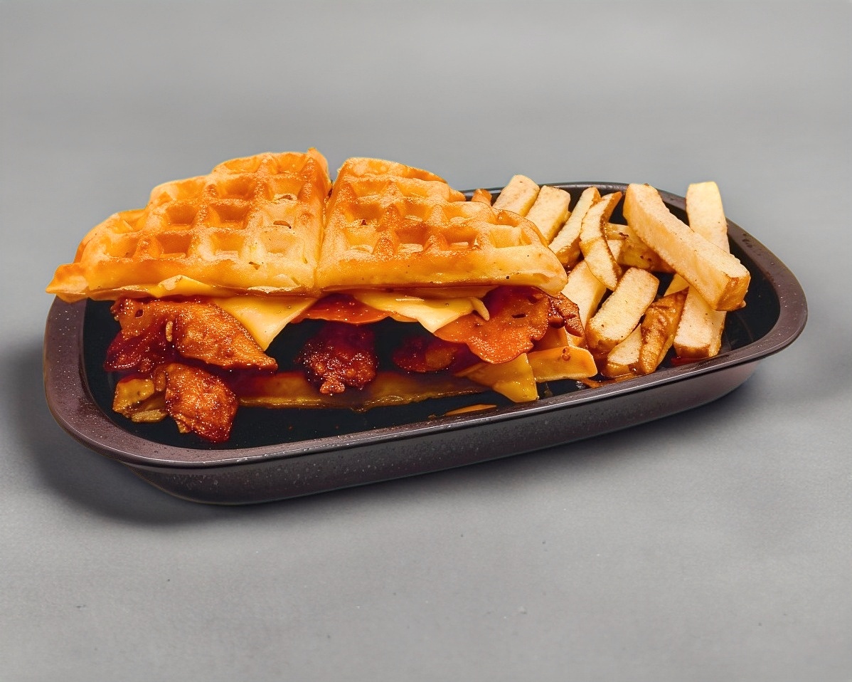 Sandwich de waffle con pollo frito bañado en hot honey, tocino y queso, acompañado de papas fritas