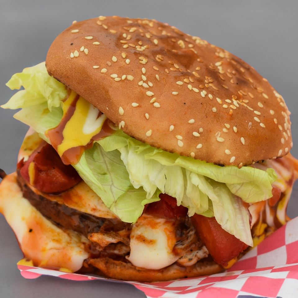 140 grs. de carne 100% de sirloin asada al carbón bañada en la mejor salsa bbq, queso amarillo, ¼ de salchicha para asar, cebollita asada, pepinillo, lechuga, mayonesa, mostaza y cátsup