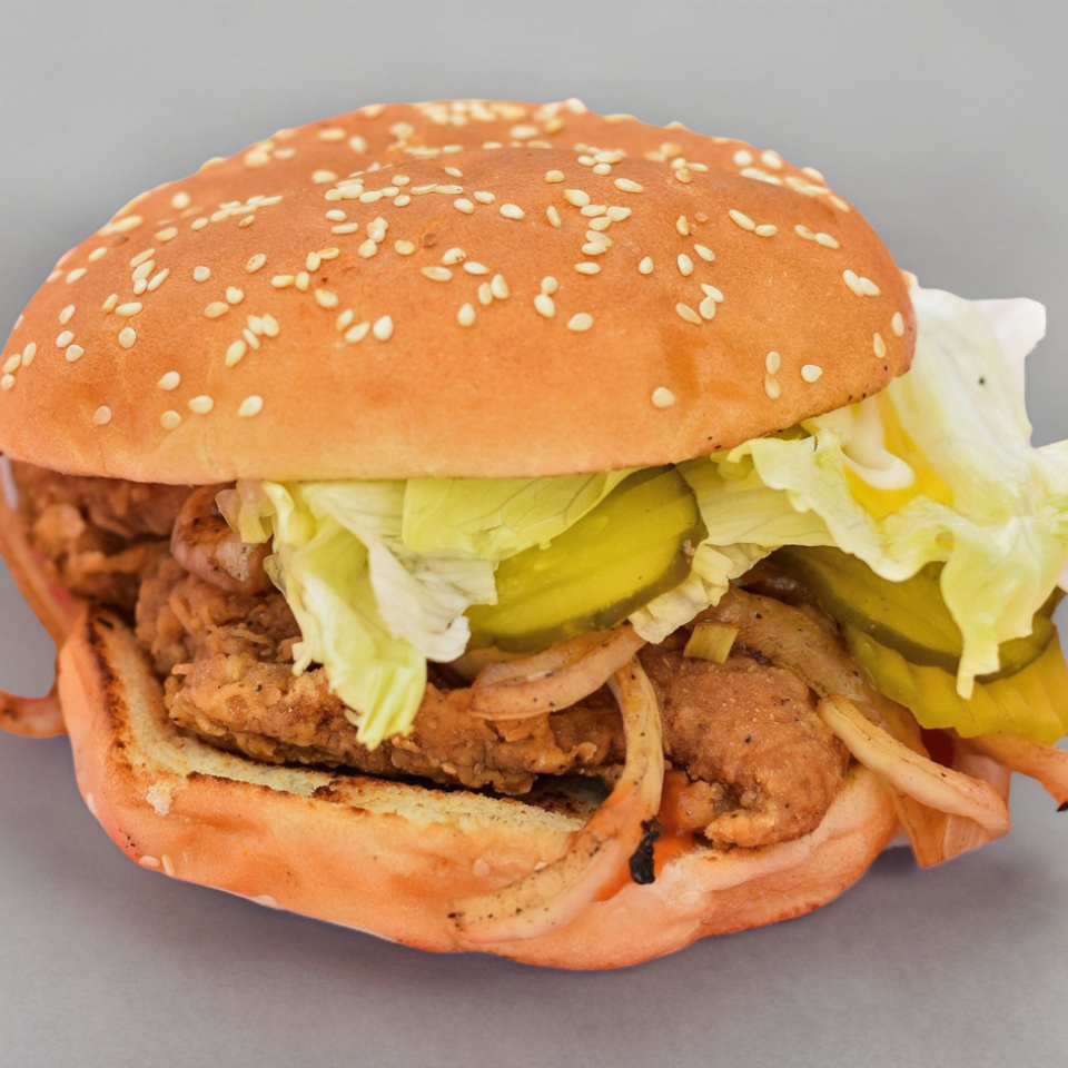 100% pechuga de pollo empanizadas spicy, cebollita asada, pepinillo, lechuga, mayonesa, mostaza y cátsup.