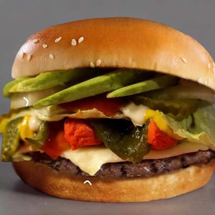 140 grs. de carne 100% de sirloin asada al carbón, queso asadero, 1 salchicha para asar, aguacate, cebollita asada, pepinillo, lechuga, mayonesa, mostaza y cátsup, el pan cubierto con asadero y pepperoni . (pizzaburguer)