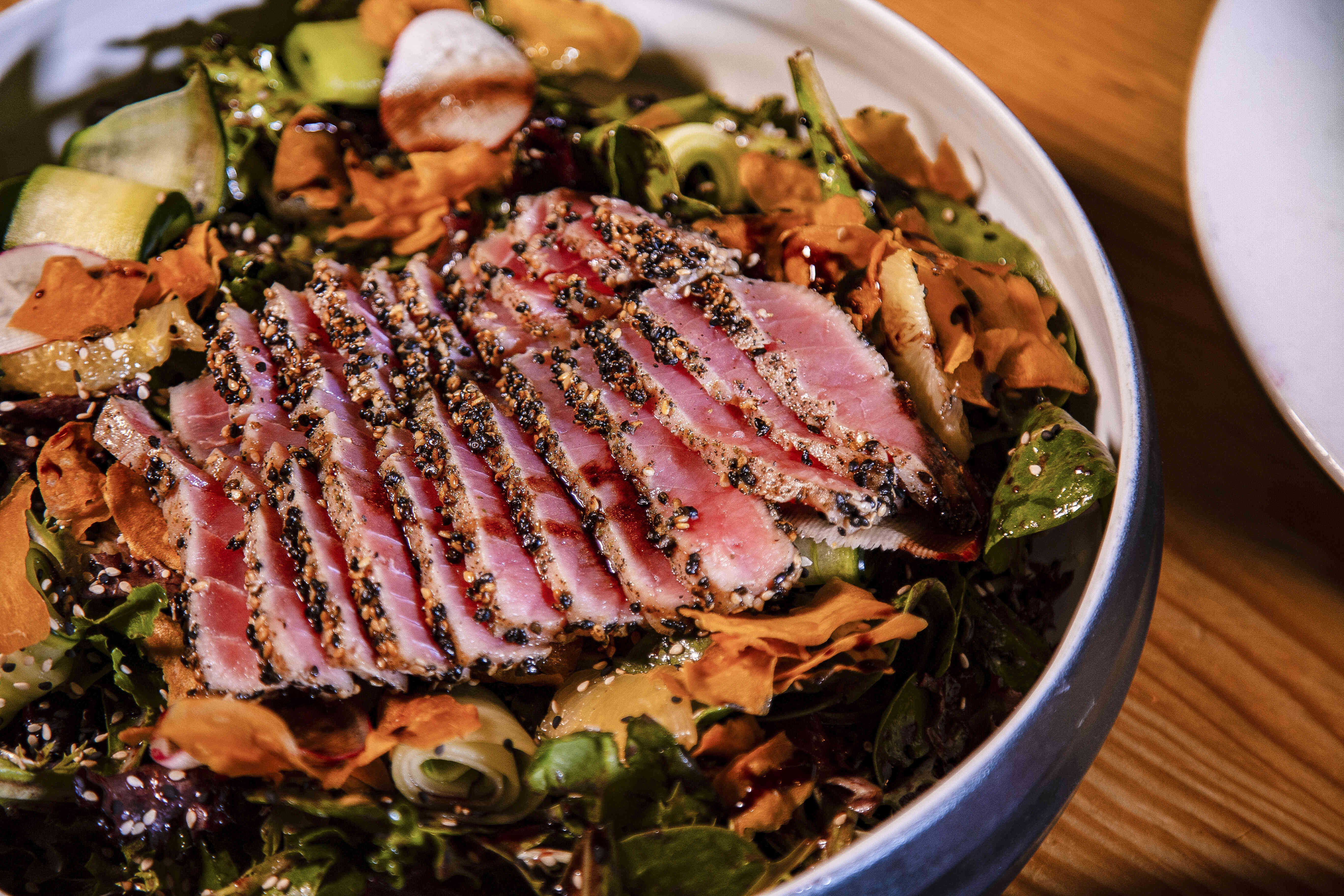 Mix de lechugas, atún sellado con ajonjolí y camote frío, suprema de naranja, pepino y rábano