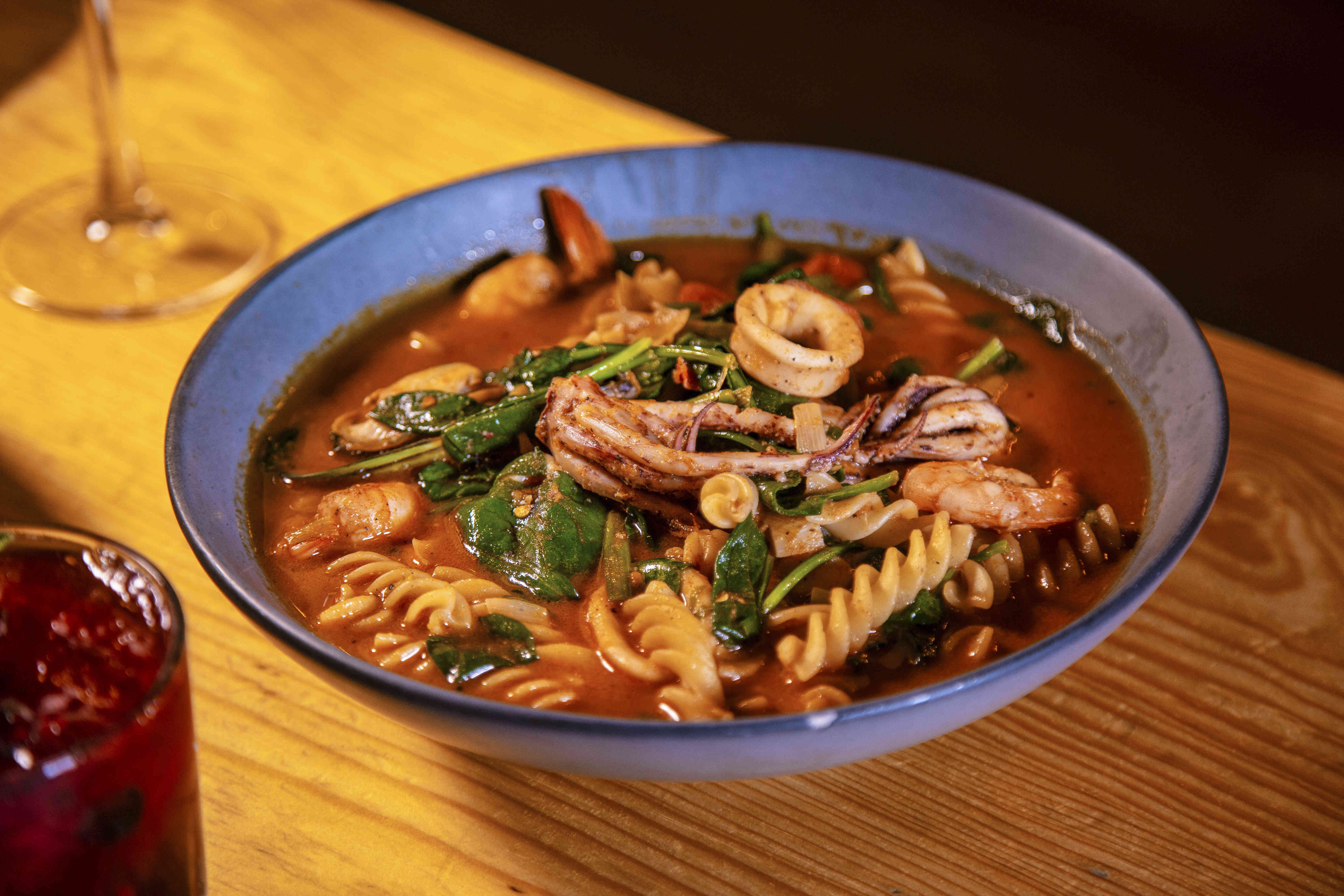 Camarones, mejillón y calamar salteado con cebolla de rabo, espinaca, tomate cherry, fusilli con caldo de tomate, vino blanco y chile de árbol