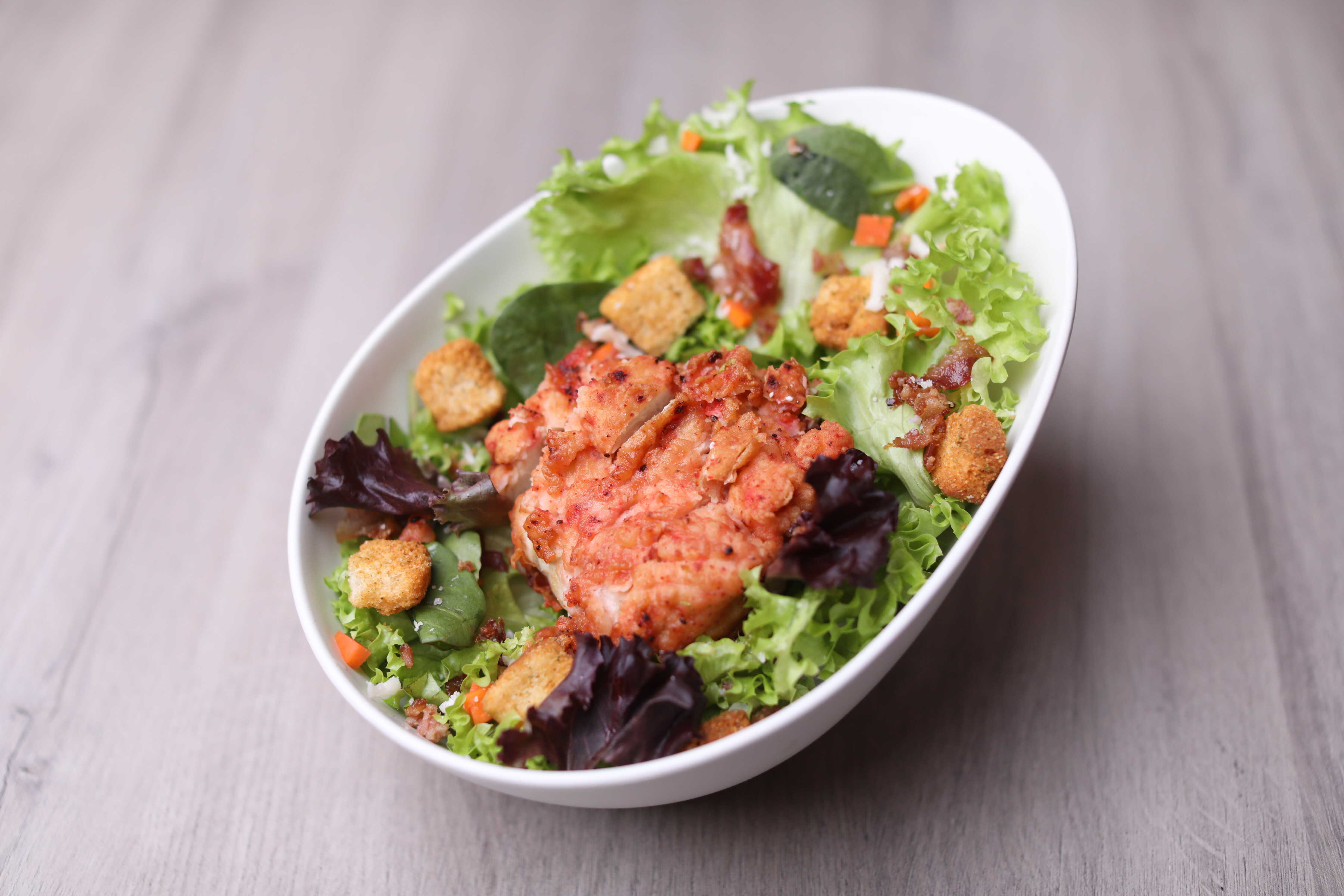 Pechuga pollo o spicy, verdura, Tocino, menonita, aderezo, croutones