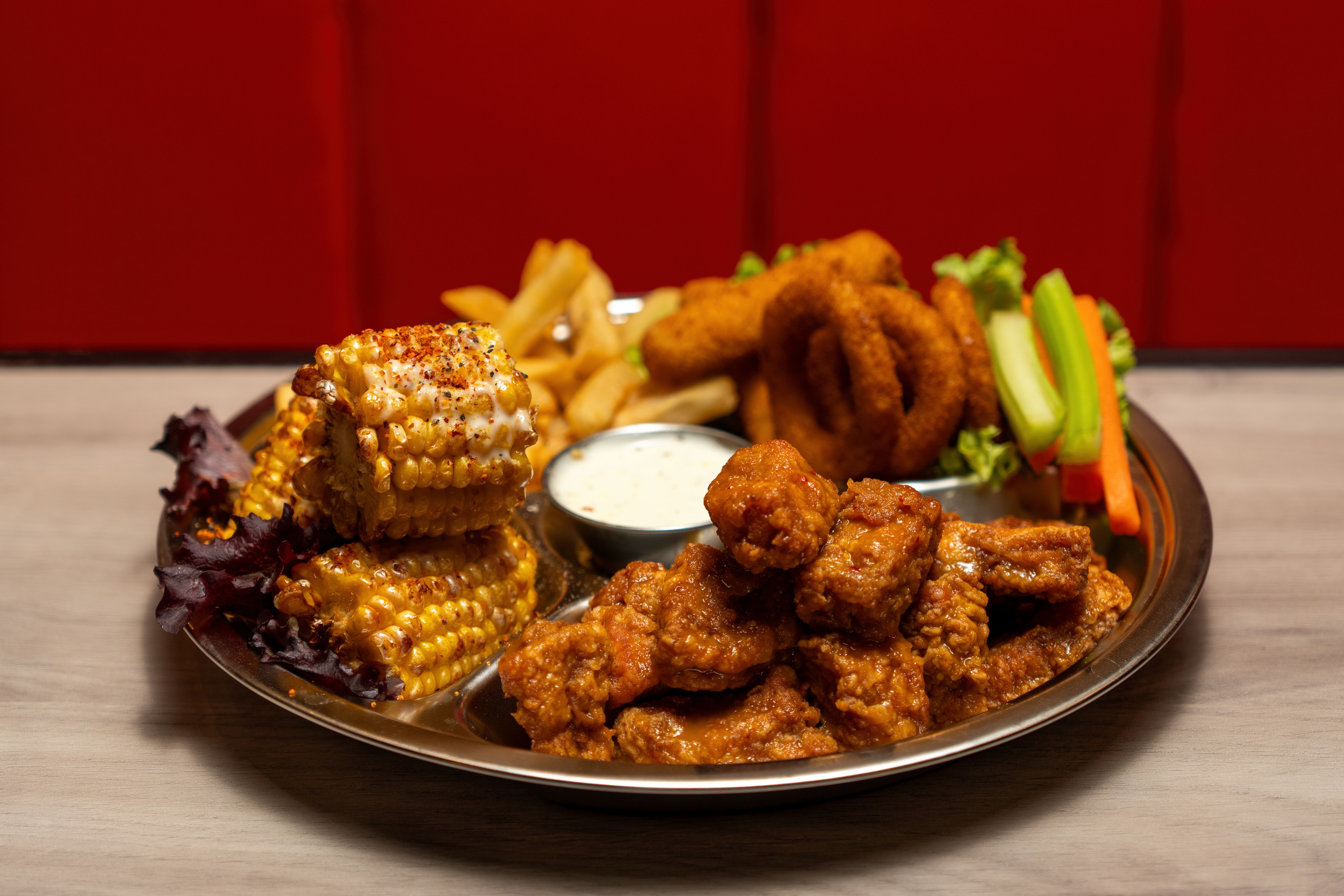 1Kg de pechuga (2 salsas), papa francesa, 6 aros de cebolla y 6 dedos de queso, 4pz elotitos