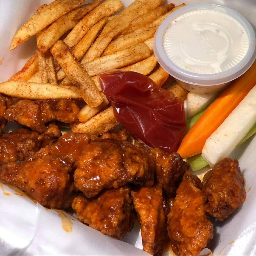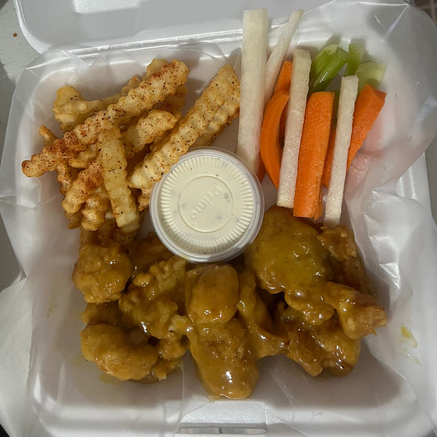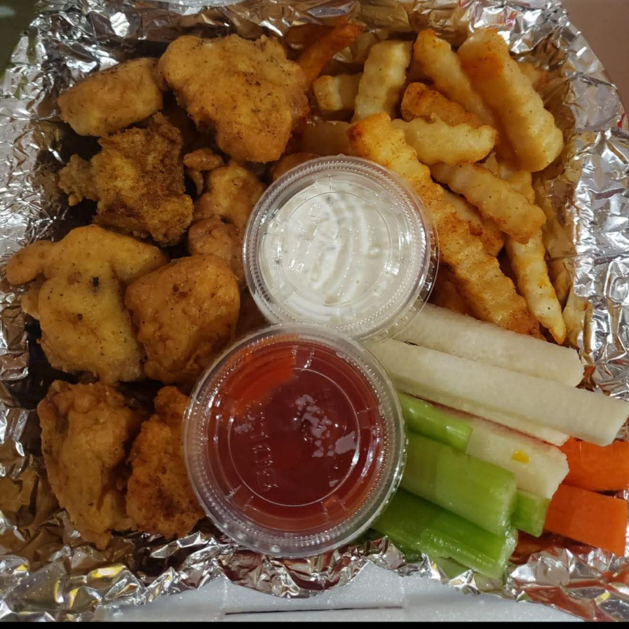 Deliciosos 270 trozos de pollo empanizada, acompañado de papas a la francesa sazonadas , verdura fresca junto con aderezo ranch.