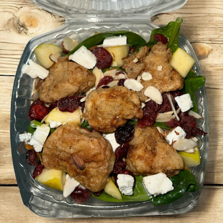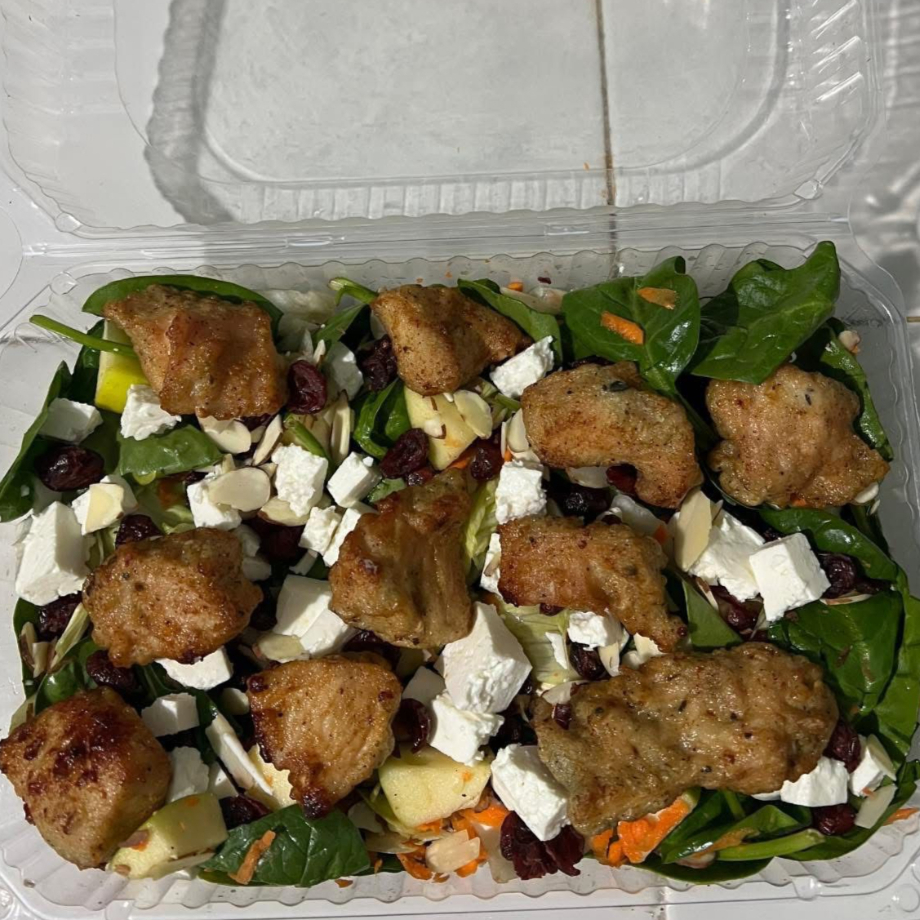 Deliciosa ensalada con boneless, espinacas,lechuga, zanahoria, manzana, arandanos, alemendras , queso panela