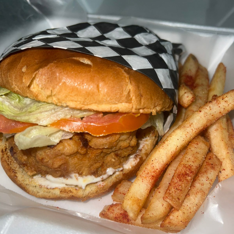 Hamburguesa de deliciosa pechuga bañada en tu salsa favorita con su porcion de papas.