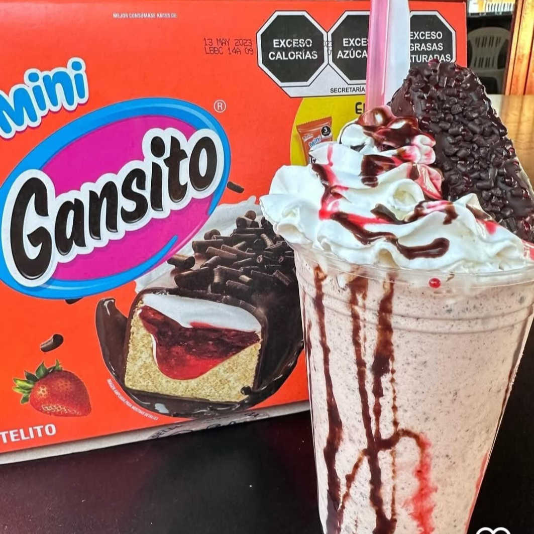 Frappe de gansito con los ingredientes originales ademas acompañado de una barra de gansito para disfrutarlo.