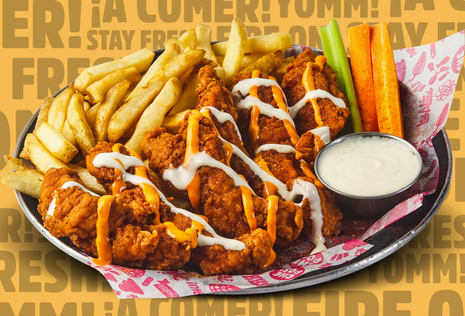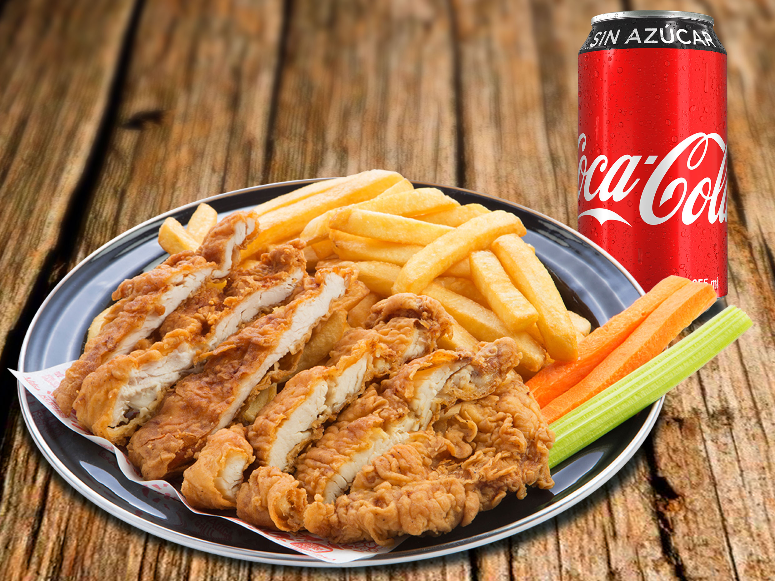 Jugosa y fresca pechuga (120 g) cortada en trozos. Empanizados, cocinados al momento y bañados en salsa de tu elección, con verduras y aderezo a elegir. Acompañados con Papas. Fritas como guarnición.