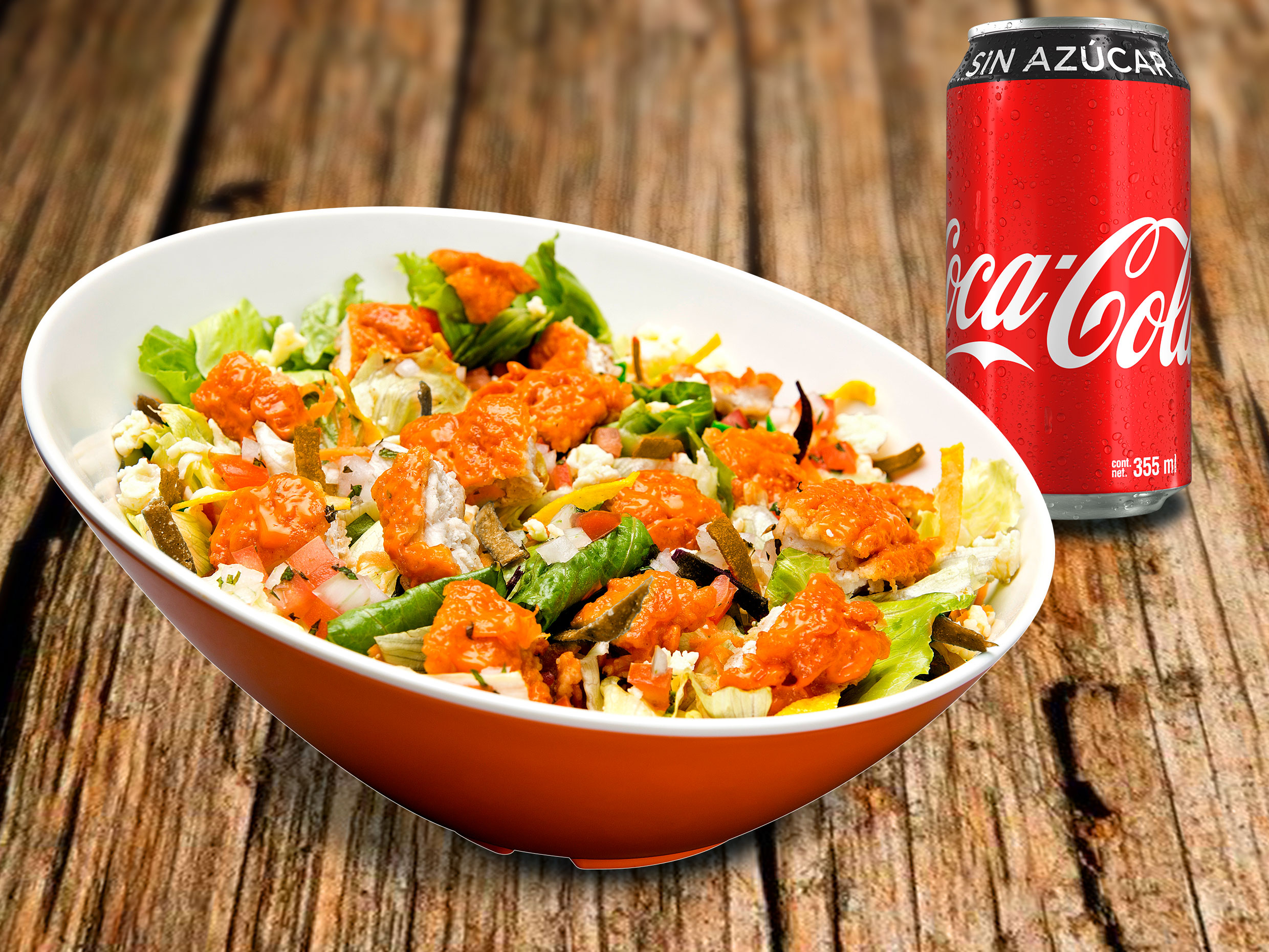 La ensalada favorita de Las Alitas, con pechuga de pollo (115 g) empanizada bañada en tu salsa favorita sobre lechugas mixtas, queso Monterrey Jack, pico de gallo y tiritas de tortilla doradas al momento.