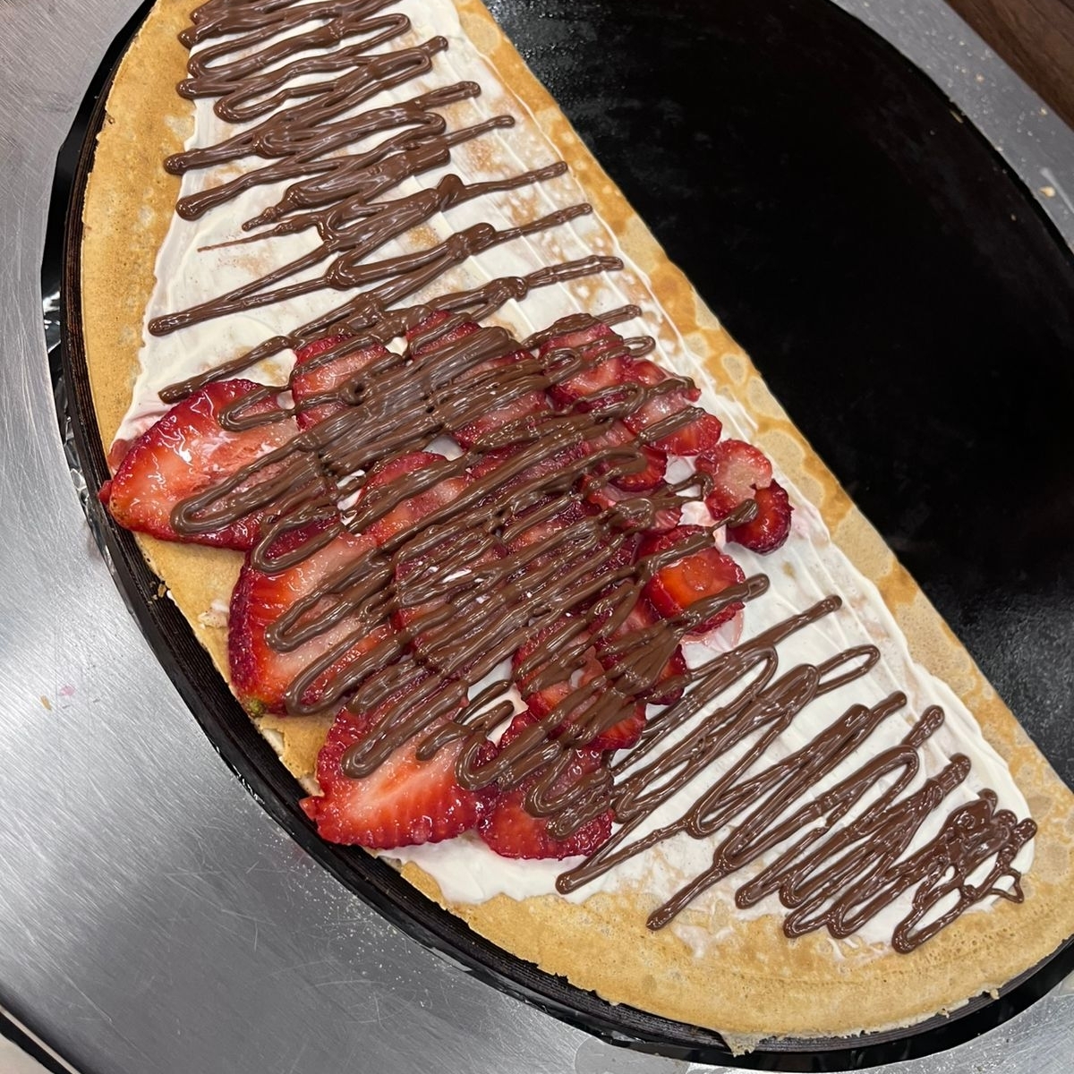 base pan de crepa rellena de queso philadelphia' fresas naturales y Nutella.