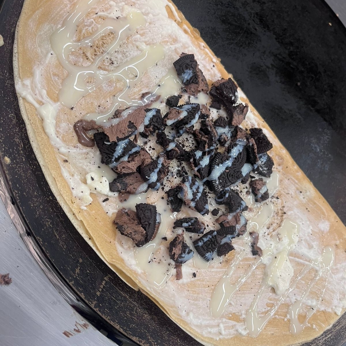 base pan crepa rellena de queso philadelphia' galleta oreo y lechera.