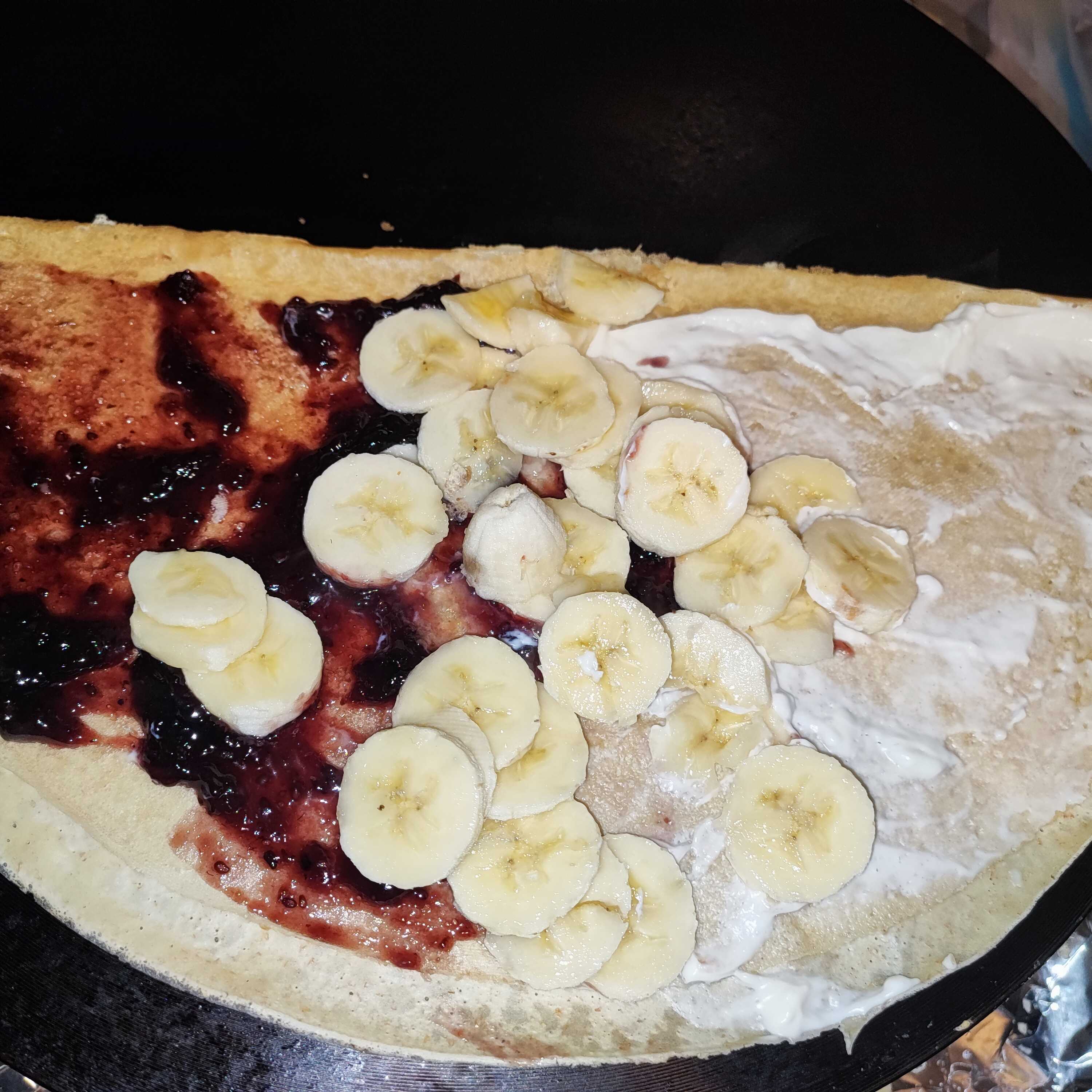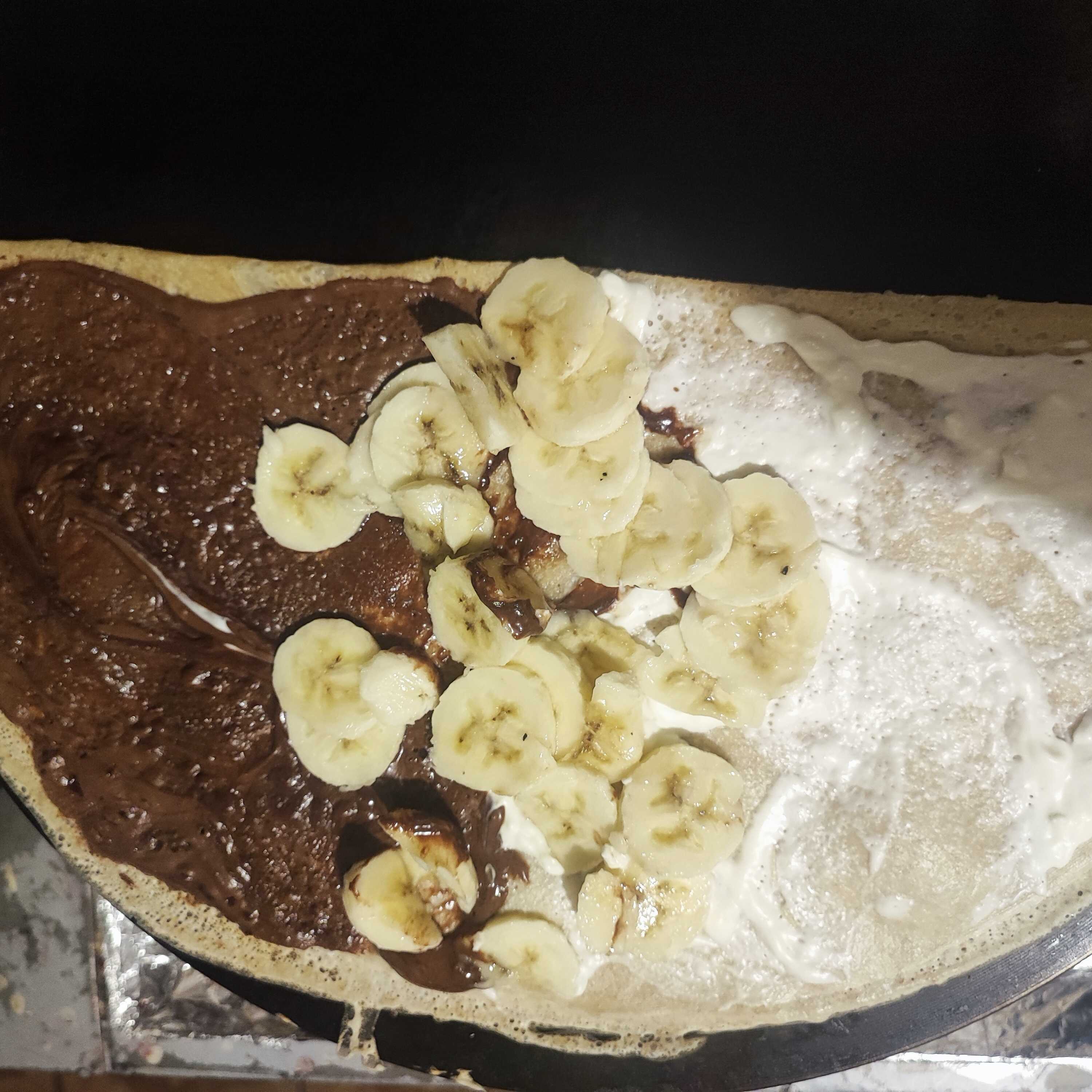 base pan de crepa rellena de queso philadelphia' plátano y Nutella.