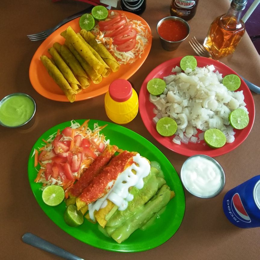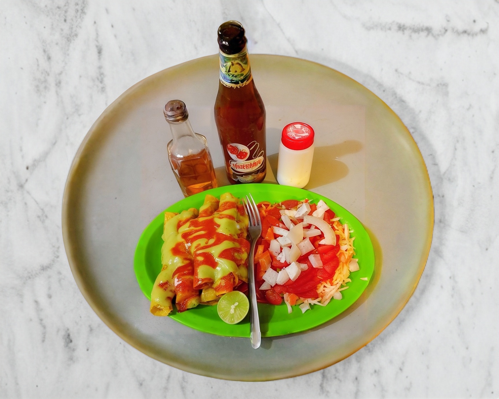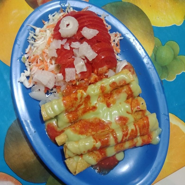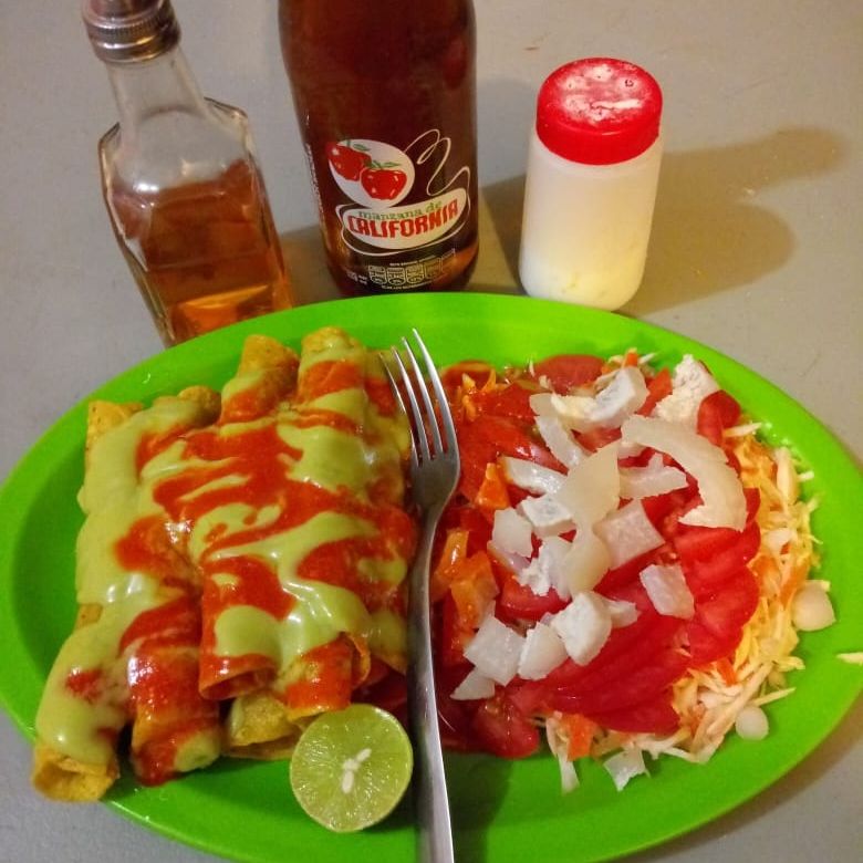 Carne Deshebrada, tortilla de maíz delgadita, ensalada de col, guacamole y salsa.