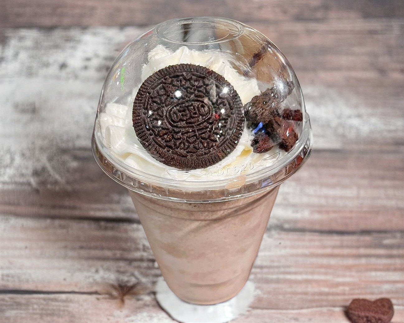 Bebida frappeada con base sabor café capuchino y un toque de galleta molida Oreo adornado con crema batida