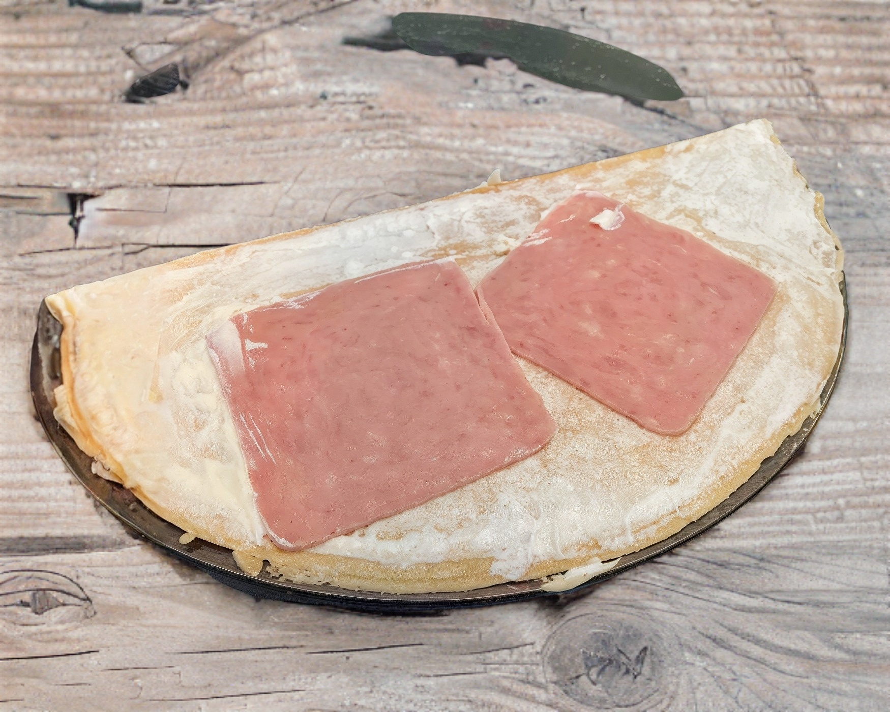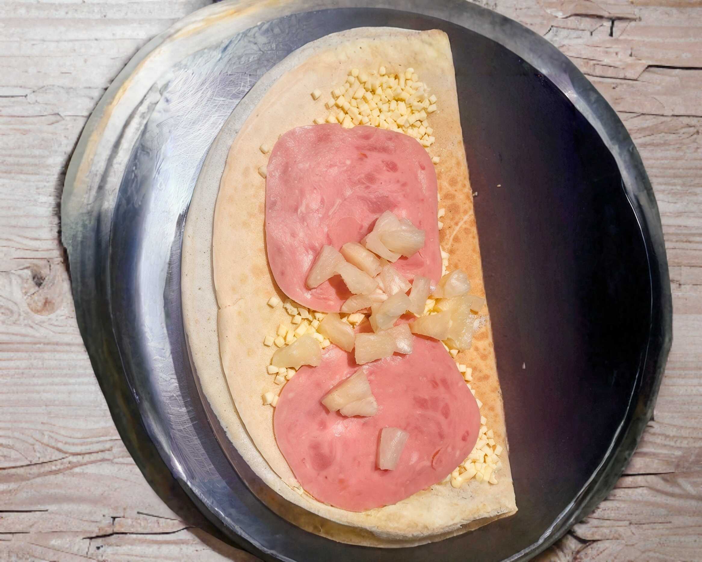 Crepa preparada con queso manchego, jamón y rebanadas de piña