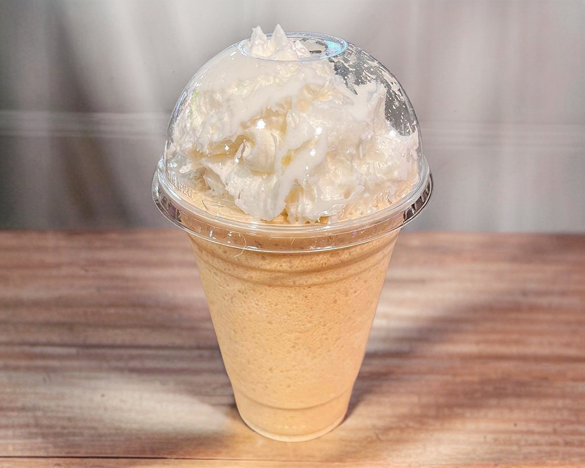 Bebida frappeada con base sabor café capuchino adornado con crema batida