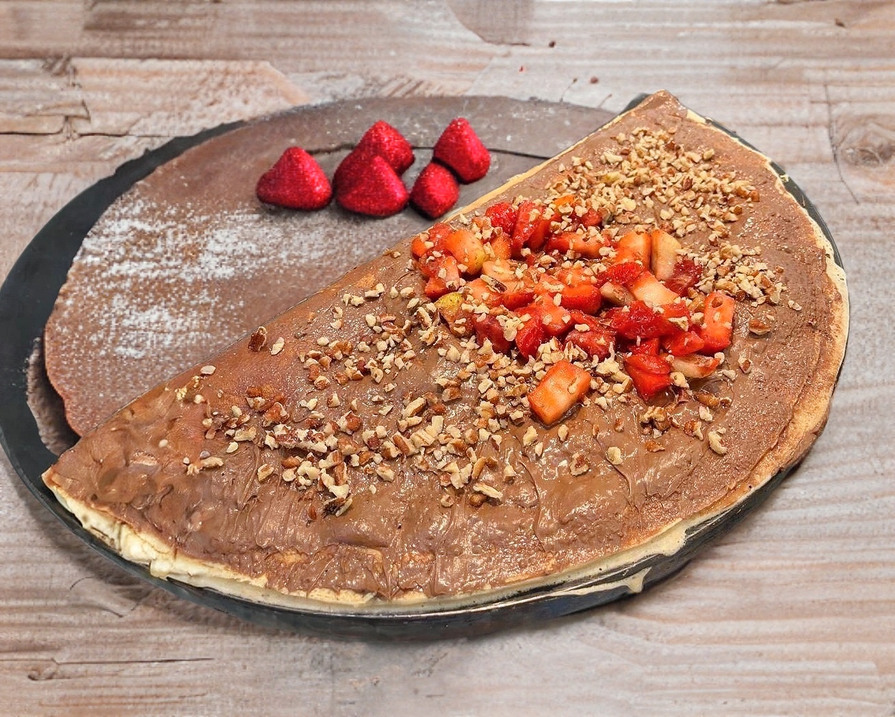 Crepa dulce a base de crema de avellana Nutella, nuez y trozos de fresas naturales