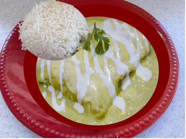 Enchiladas suizas de pollo con salsa de poblano y queso.