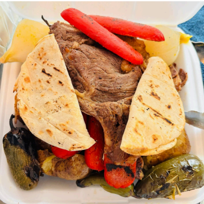 4 tacos de asada, papa con mantequilla, cebolla, chiles toreados y guacamole.