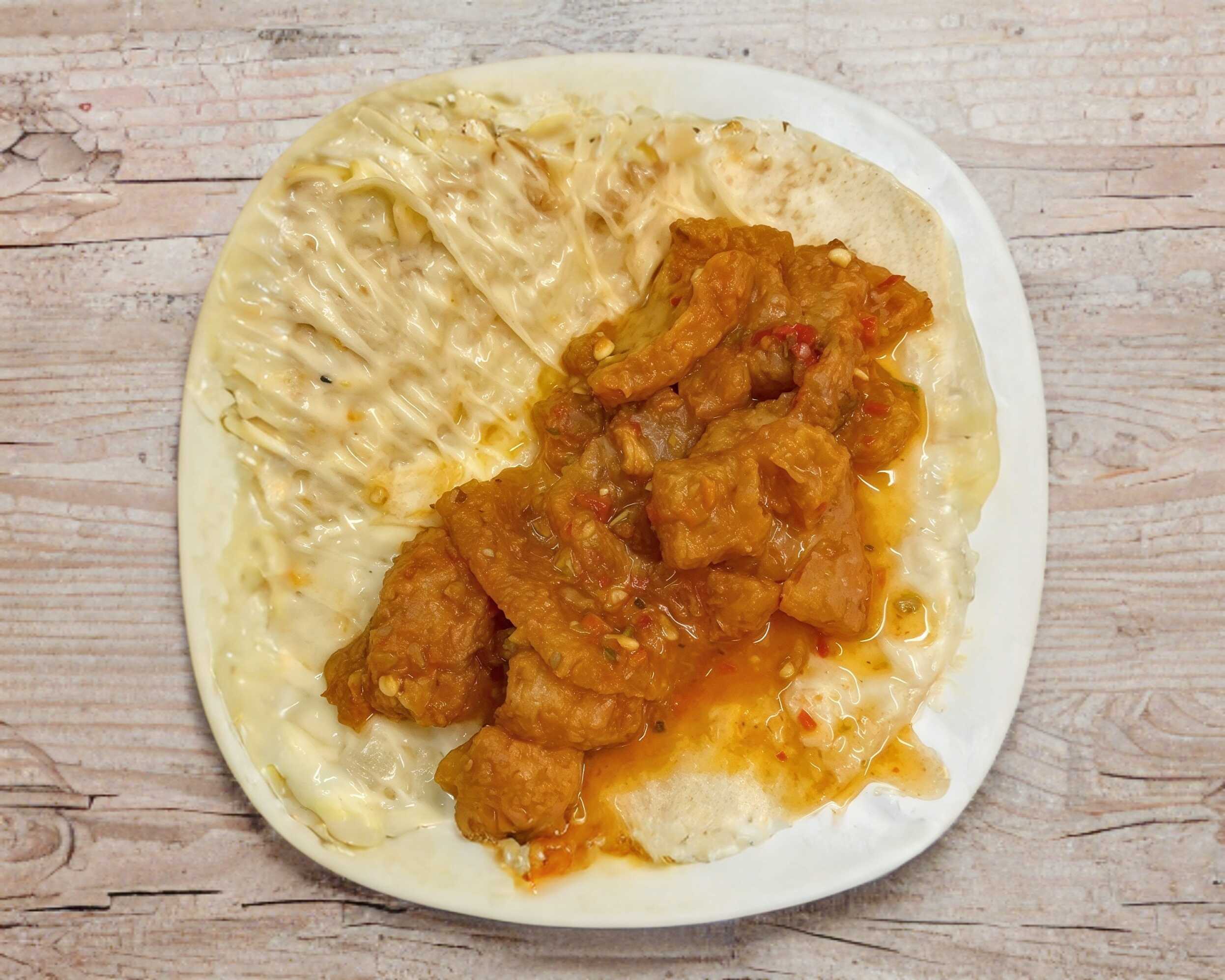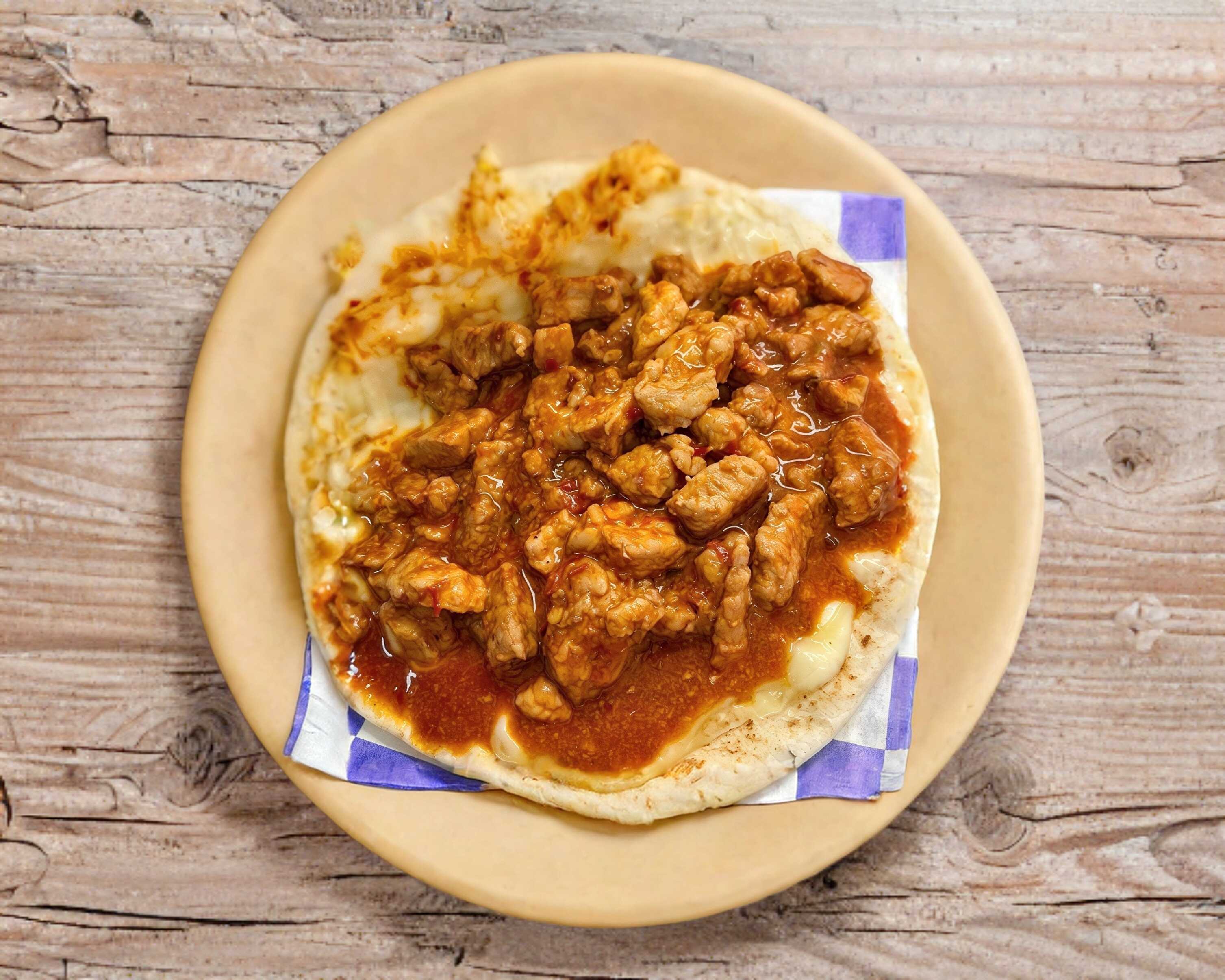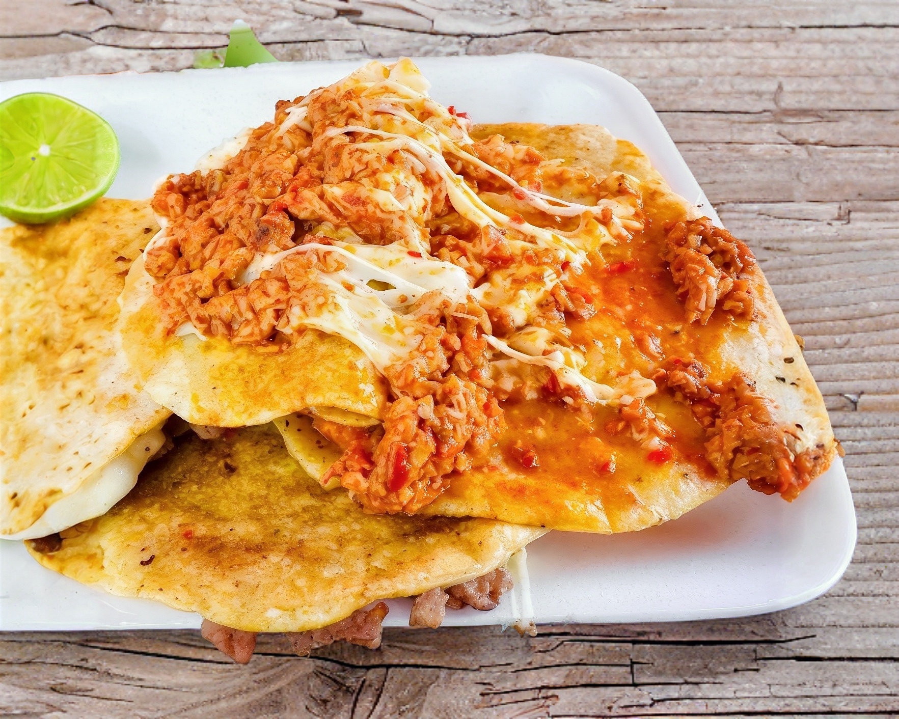 Quesadilla de harina con asadero de villa ahumada, con chicharron de peya en salsa de jalapeño rojo.