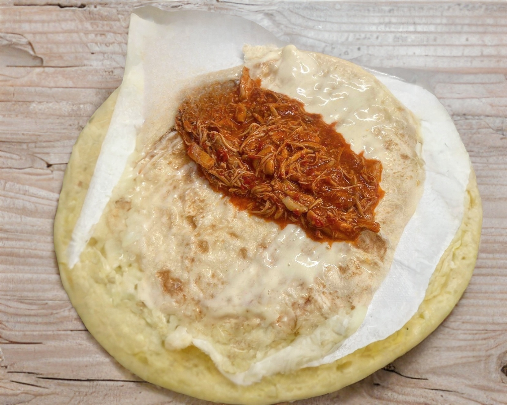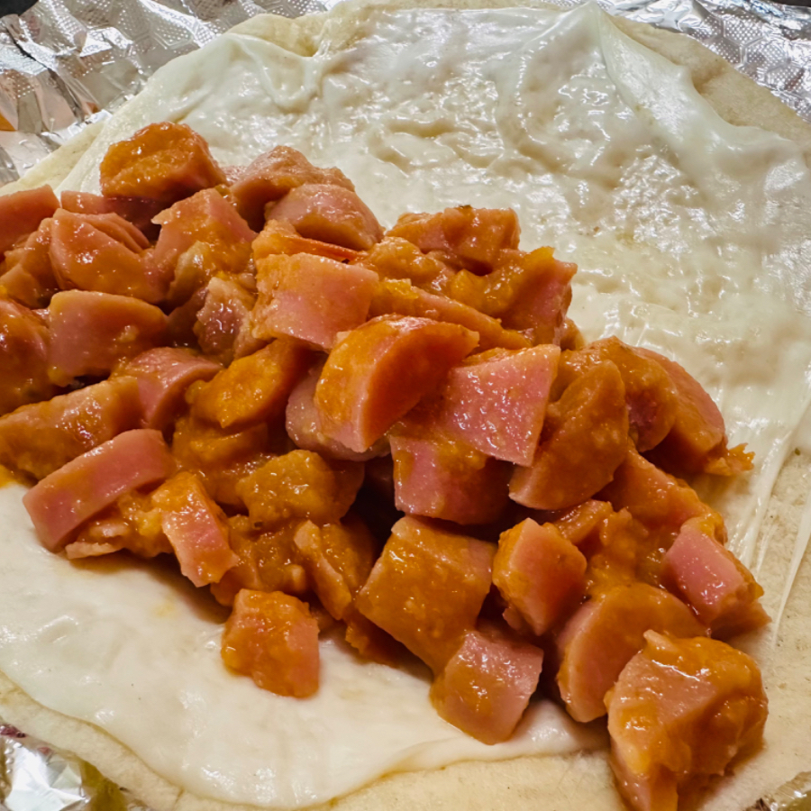 Quesadilla de harina, con asadero de Villa Ahumada, y winnie en salsa de tomate casera.