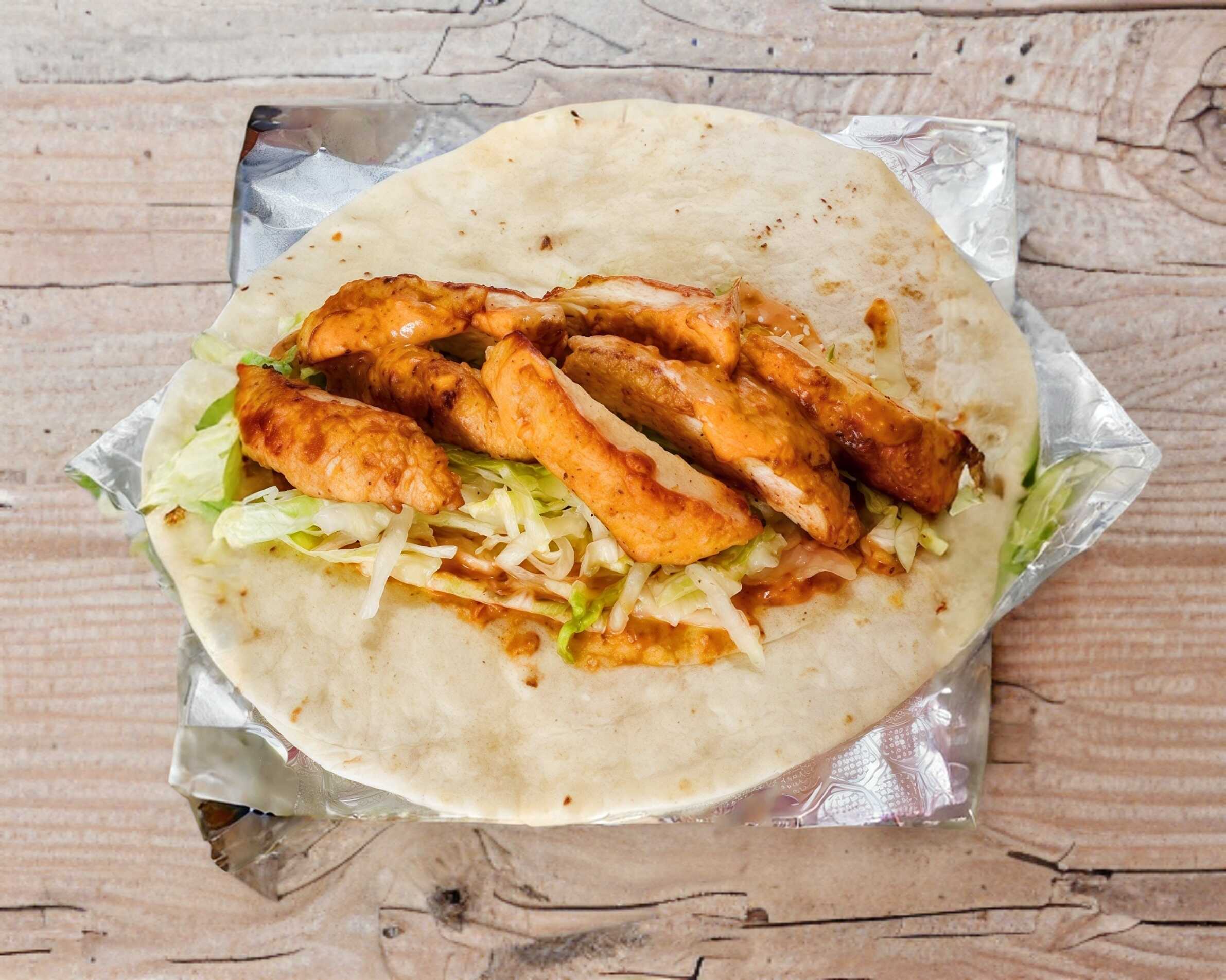 Pechuga de pollo empalizada, en una cama de lechuga, con aderezo chipotle, todo envuelto con una tortilla de harina.