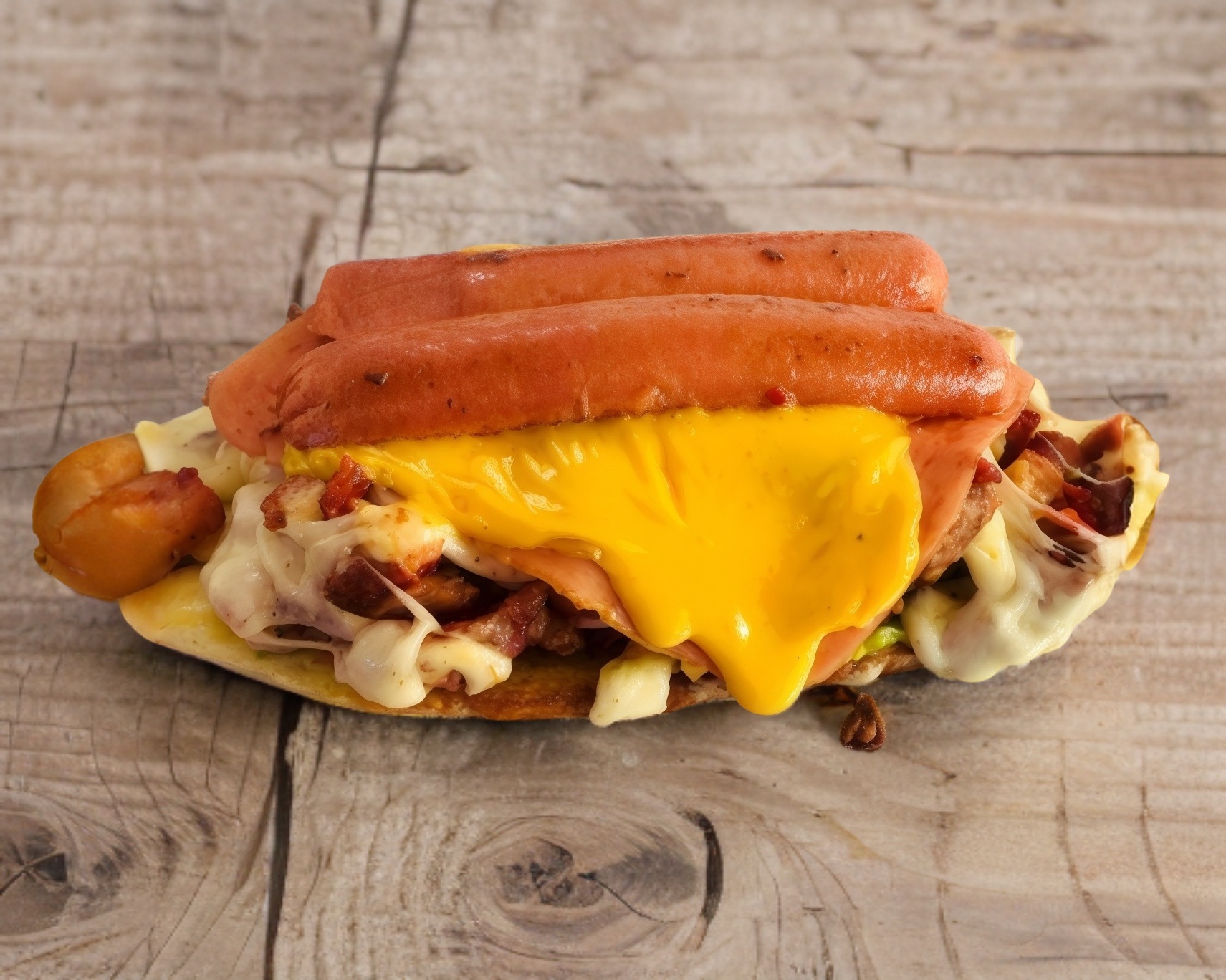 Hamburguesa de carne de Sirloin, con salchicha para asar, queso asadero, aguacate, tomate, lechuga, mayonesa, tomate, catsup, y mostaza.