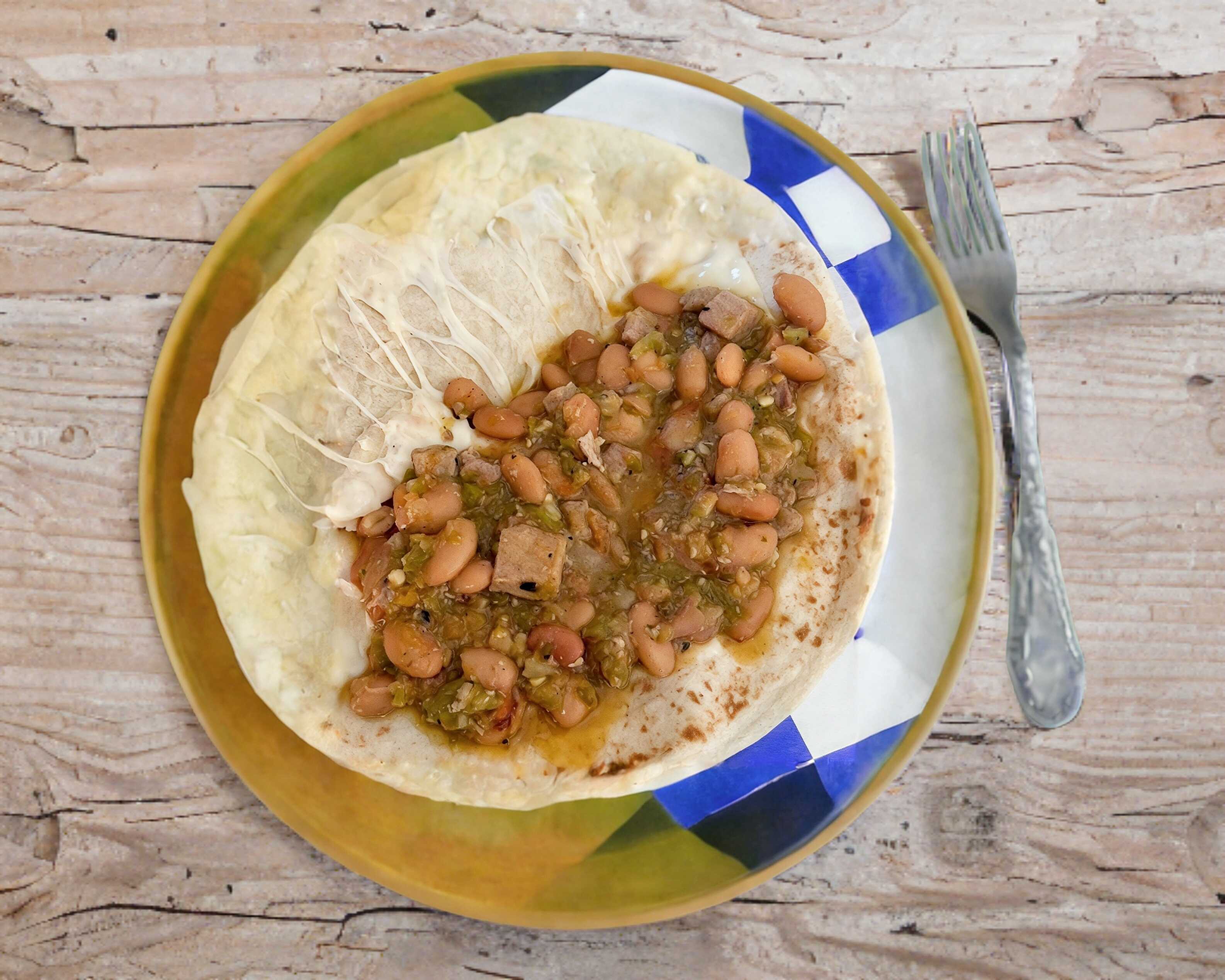 Burrito de puerco con frijoles graneados en salsa verde.