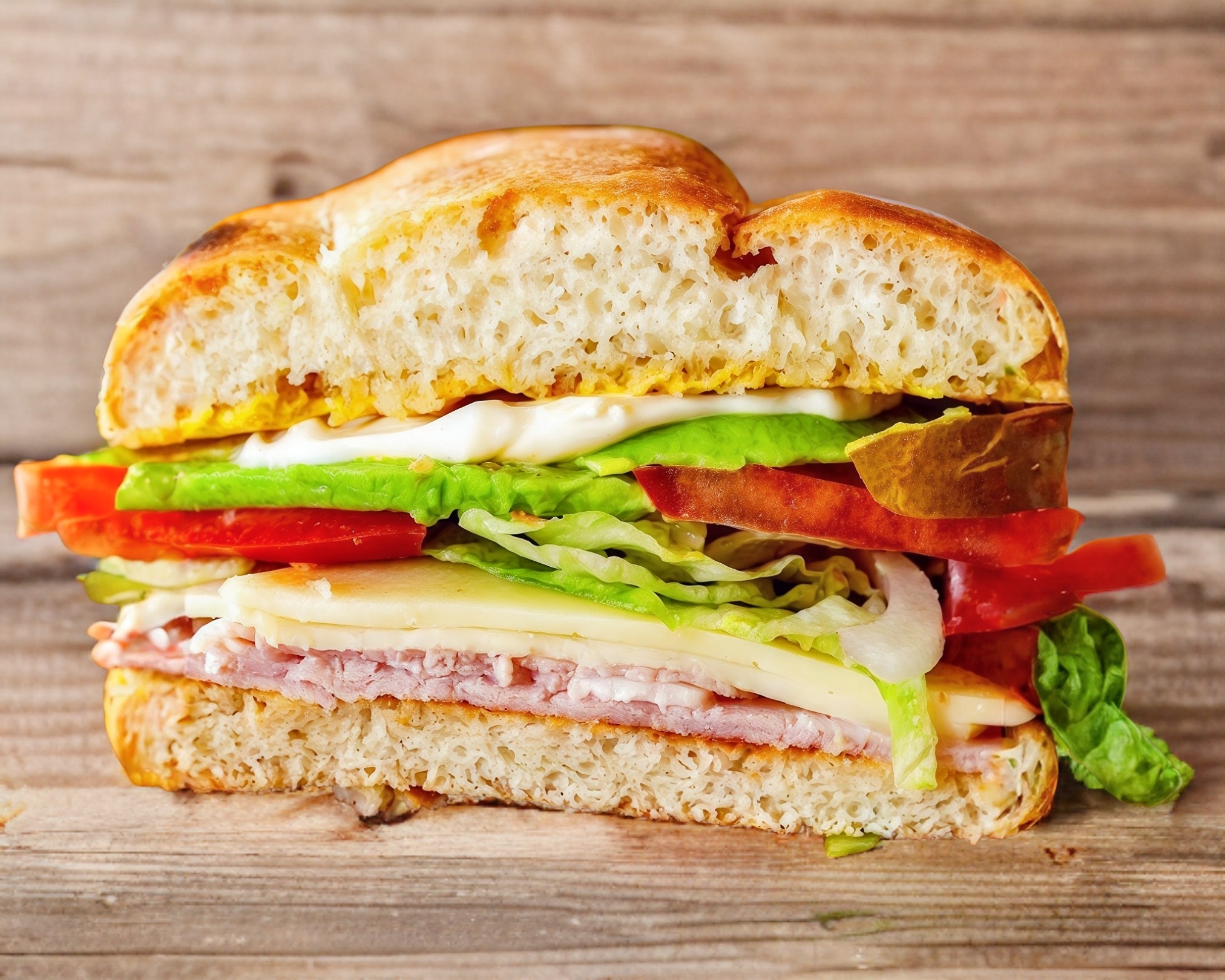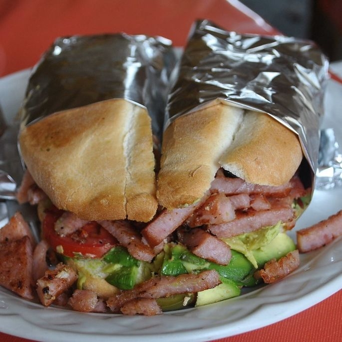 Torta de jamón de pavo, con queso blanco y amarillo, aguacate, lechuga, tomate y mayonesa.