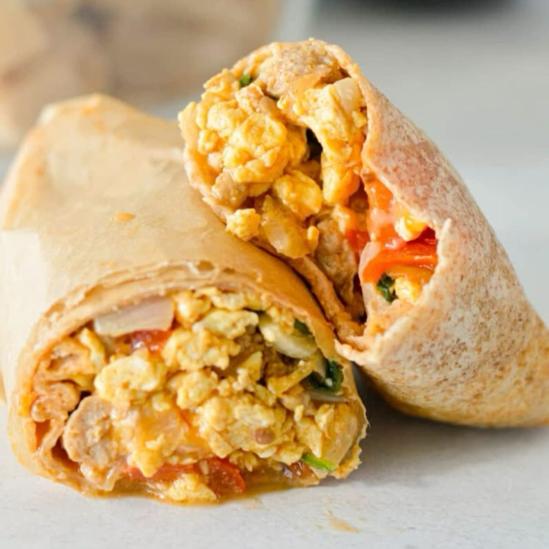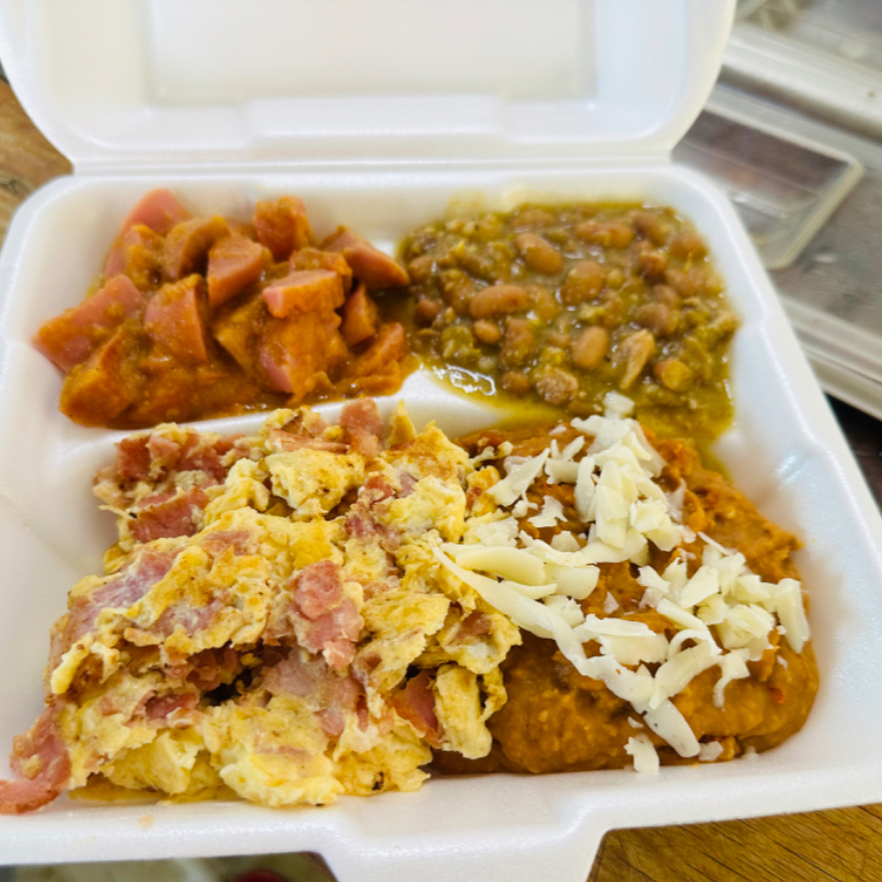 Huevo Revuelto con un ingrediente, acompañado de frijoles con queso y dos guarniciones a elegir.